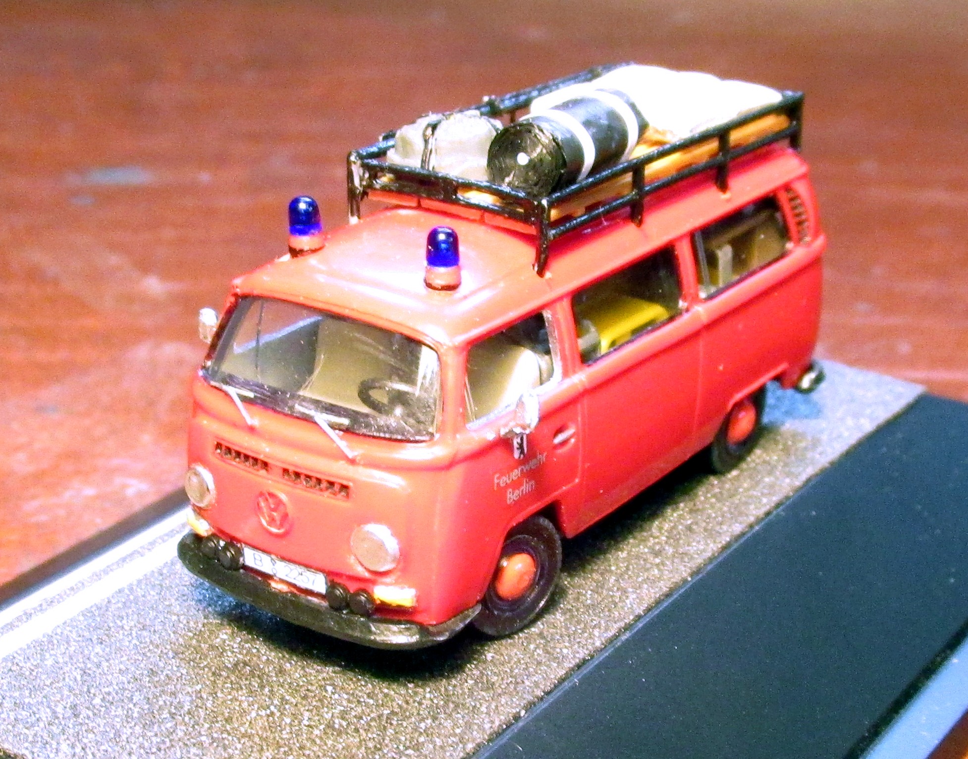 Ein VW T2 von Wiking wurde innen mit der endsprechenden Beladung versehen, das Lenkrad wurde getauscht und erhielt auch gleich noch ein Armaturenbrett.