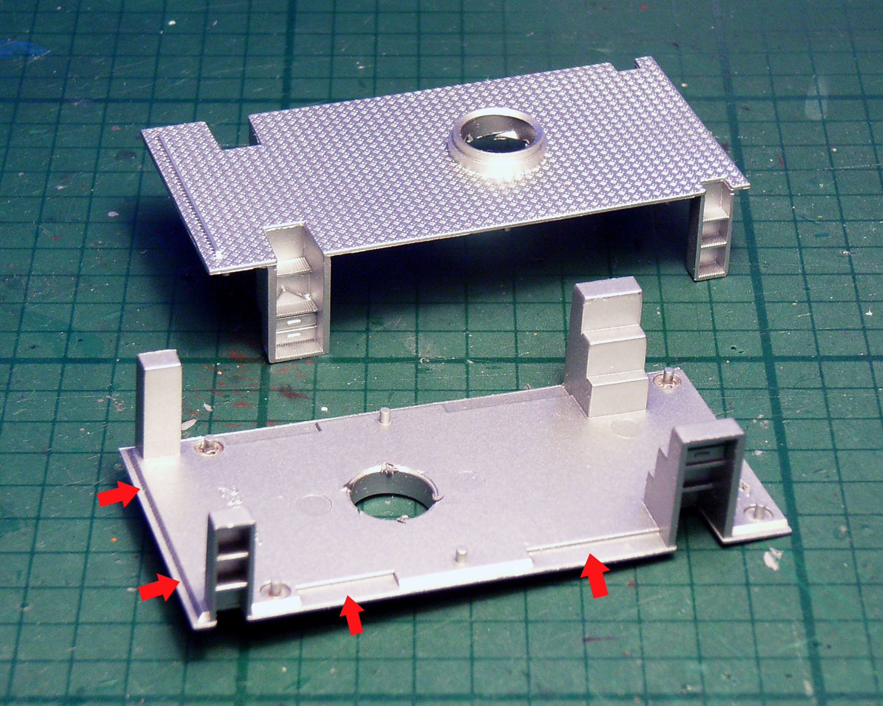 Und wundert euch bitte nicht über die zahlreichen weißen Bröckchen auf der Podestoberseite: Das sind die künftigen Klebepunkte zur Befestigung der - mittlerweile dünn gefrästen und zugeschnittenen - Riffelblechfläche (die auf dem letzten Foto nur lose aufliegt).