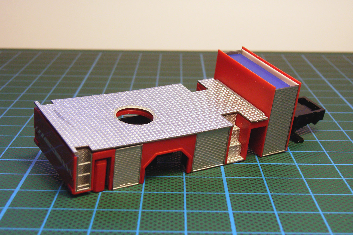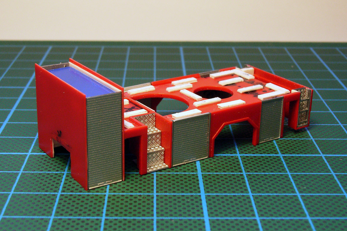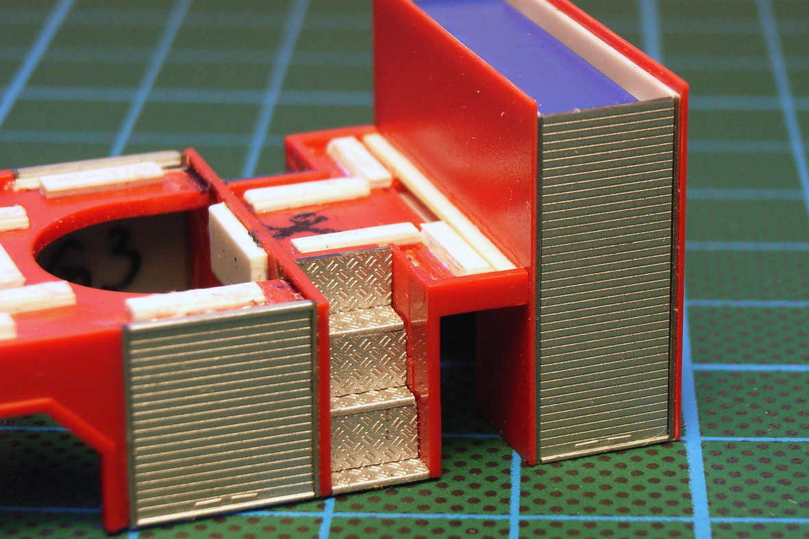Die hinteren Aufstiege hab ich dann doch nicht so gelassen - die jetzige Version sieht m.E. wesentlich besser aus. Die vorderen "Treppen" wurden aus je sechs dünn geschliffenen Riffelblechstücken der Herpa-Leiter zusammengeschnippelt.