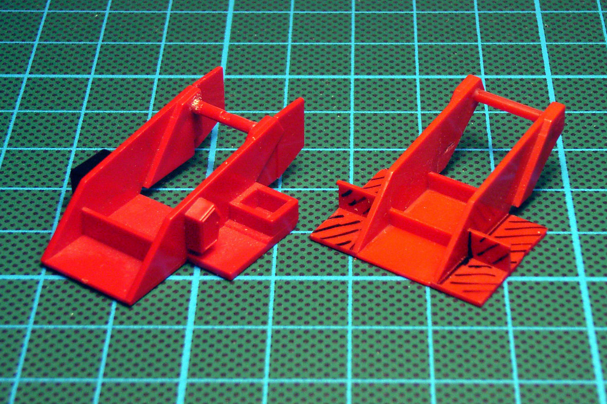 Dann noch eine neue Bodenplatte, ein stabilisierender Quersteg (oder auch zwei) und eine neue Achse zur Aufnahme der noch zu bauenden Leiterwippe - und das Ganze schön rechtwinklig in der neuen Breite zusammenpappen. Die (schraffierten) ehemaligen "Innereien" des Wiking-Teils werden natürlich teilweise noch entfernt oder dienen dem neuen Maschinistenstuhl, dem Stromgenerator und anderem Zubehör als stabile Basis!