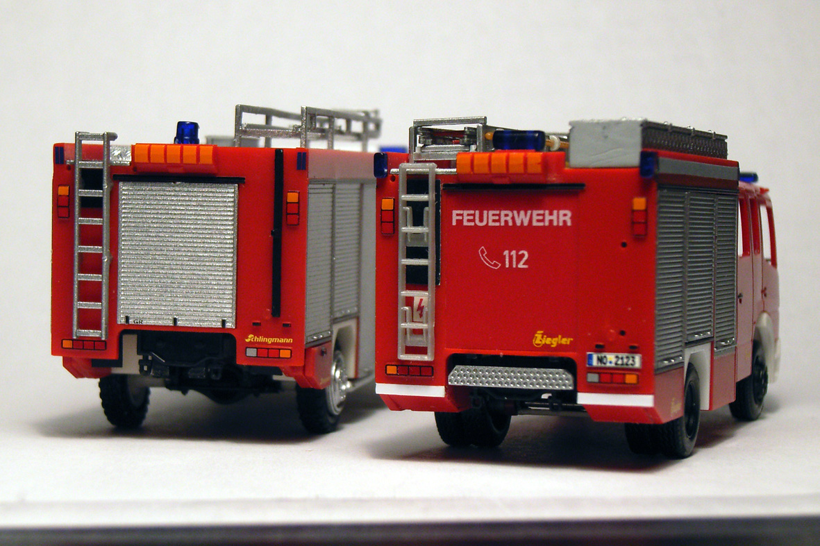 Das Heck ist fast fertig; es fehlen nur noch ein paar "Verkleidungen" am Dachgerätekasten und für die Löcher der ehemaligen LEH. Die Traversenkästen sind ebenfalls komplett, genau wie die neue Trittstufe am Pumpenstand und der neue Heckaufstieg! Fehlen eigentlich nur noch ein paar zusätzliche Farbtupfer - und evtl. ein kleiner Lichtmast (?), um die zwei Bohrungen im Heckblech zu verdecken! Unbedingt notwendig für die Verwandlung vom Schlingmann zum Ziegler ist aber die Dachblende mit der Umfeldbeleuchtung und ihren typischen T-förmigen Endstücken aus schwarzem Decal!