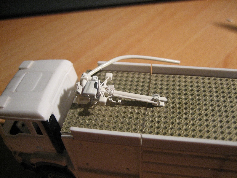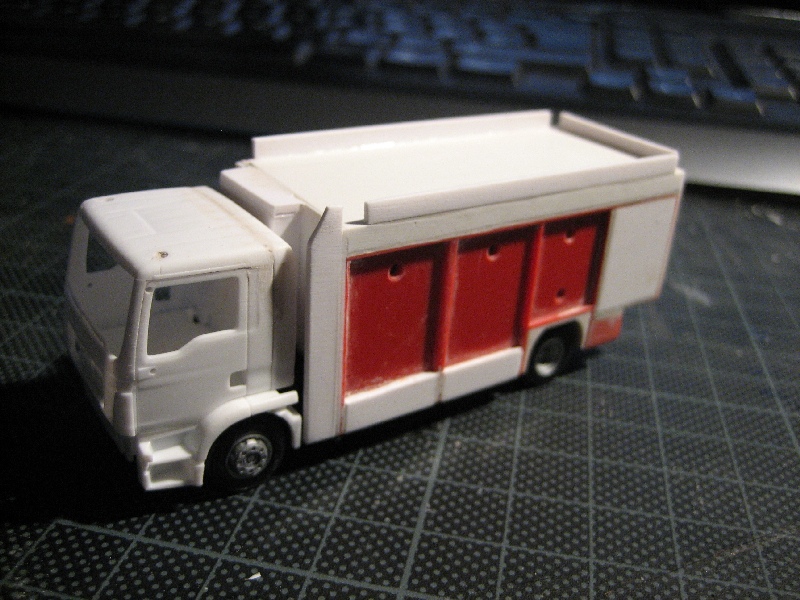 GW-G: Dieser entstand aus 2 Herpa Kabinen die zu der langen Version umgebaut wurden. Der Aufbau besteht im großen und ganzen aus 2 Rietze Aufbauten, die komplett umgebaut wurden. Ladebordwand lieferte Herpa und der Rest wieder Bastelkiste oder Eigenbau.