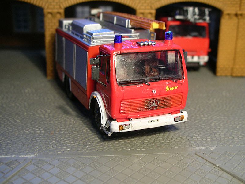 Aus den NG (Preiser und Herpa) entsteht nun also der Fuhrpark der Wache Weststadt. Das ist ein Neubaugebiet aus der Nachkriegszeit mit ein paar recht hohen Häusern (dazu später mehr), guten Straßen und ohne Wasserwege. Dementsprechend brauchte mein erstes Großfahrzeug auf NG, ein RW2 von Herpa, auch kein Schlauchboot auf dem Dach. Außer der Dachbeladung ist nur der Lichtmast geändert, der Rest ist Farbe: