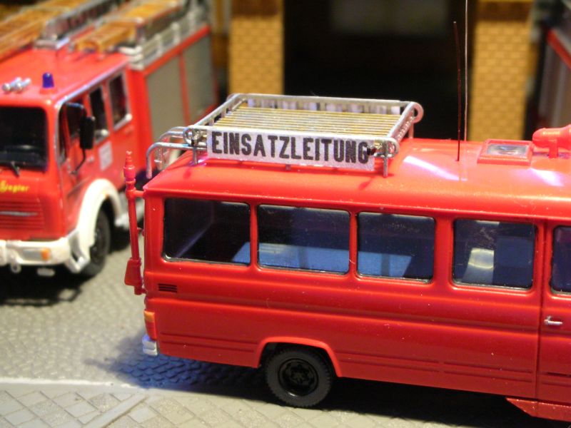 Der ELW2 hat Grill und Räder vom Herpa-Düsseldorfer bekommen, Lautsprecher von Roco, Dachschild vorn aus einem Spritzlingsrest, Einsatzleitung-Anschriften aus meinem Tintendrucker, Spiegel aus Draht und Papier und Tröten von Herpa, teils gekürzt.