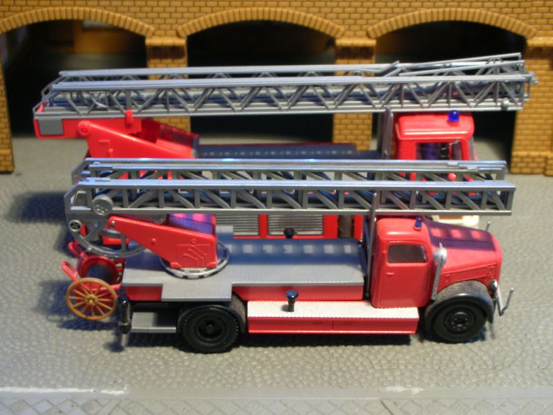 Na, gemerkt? Die Verstrebungen der Leiter sind natürlich völlig falsch. Das liegt daran, daß der Leiterpark, obschon auch von einer Metz-Leiter, so doch von einer Jahrzehnte neueren stammt: von Herpa seiner nämlich, zum Zwecke der DL25-Gewinnung um 2 Strebenfelder gekürzt -- auch weil das Ausgangsmodell eh beschädigt war. Hier nochmal die Basismodelle zum Vergleich: