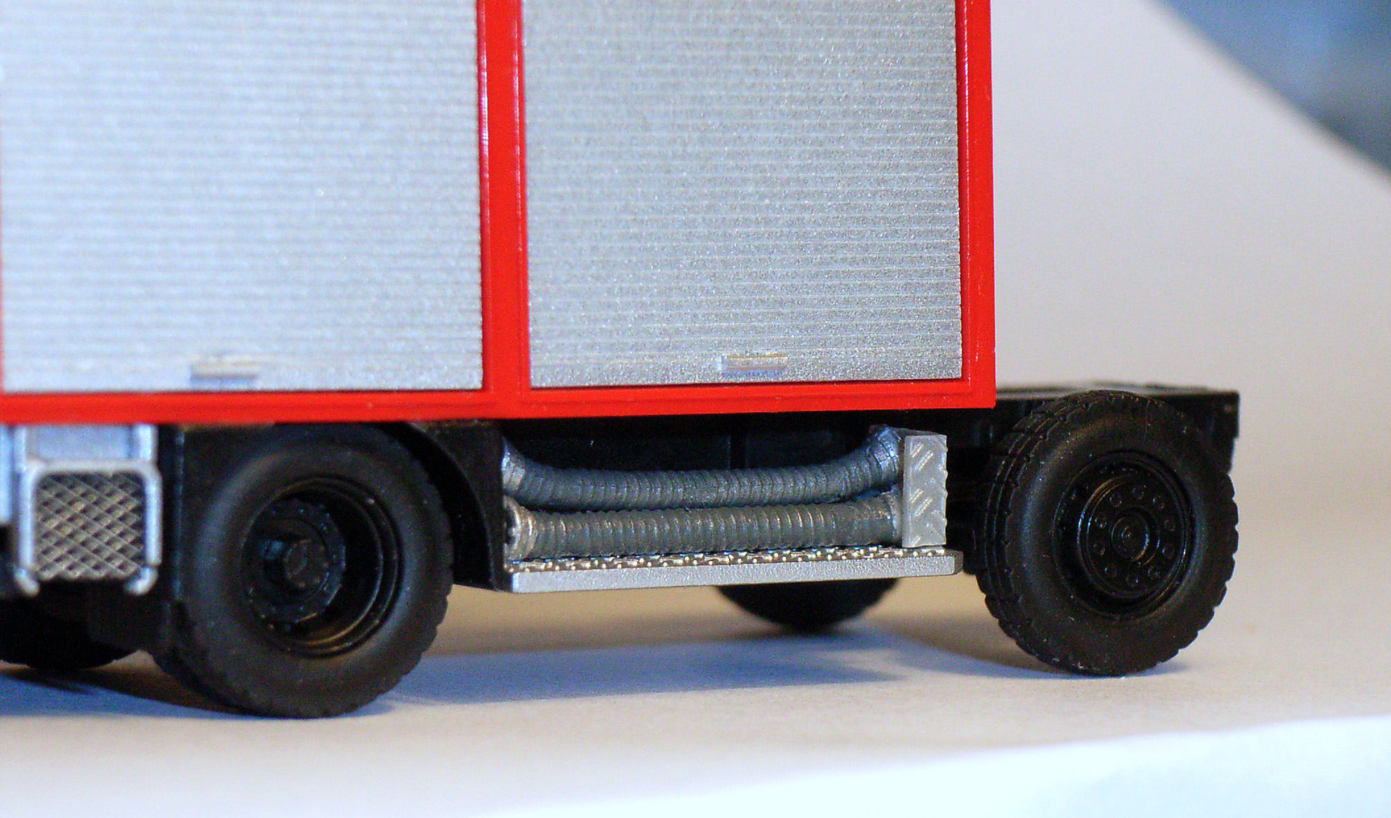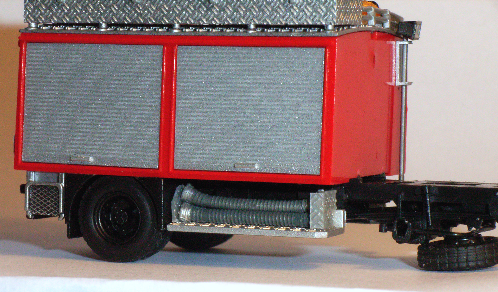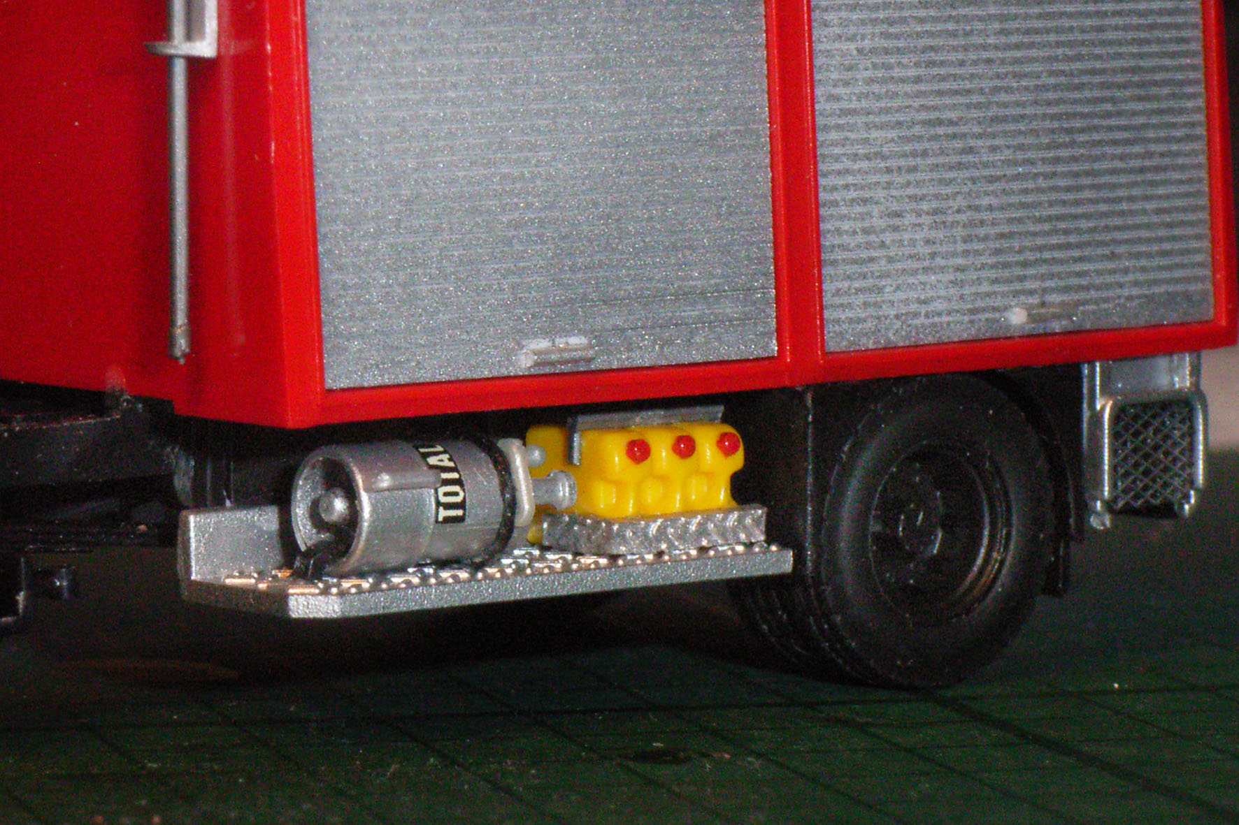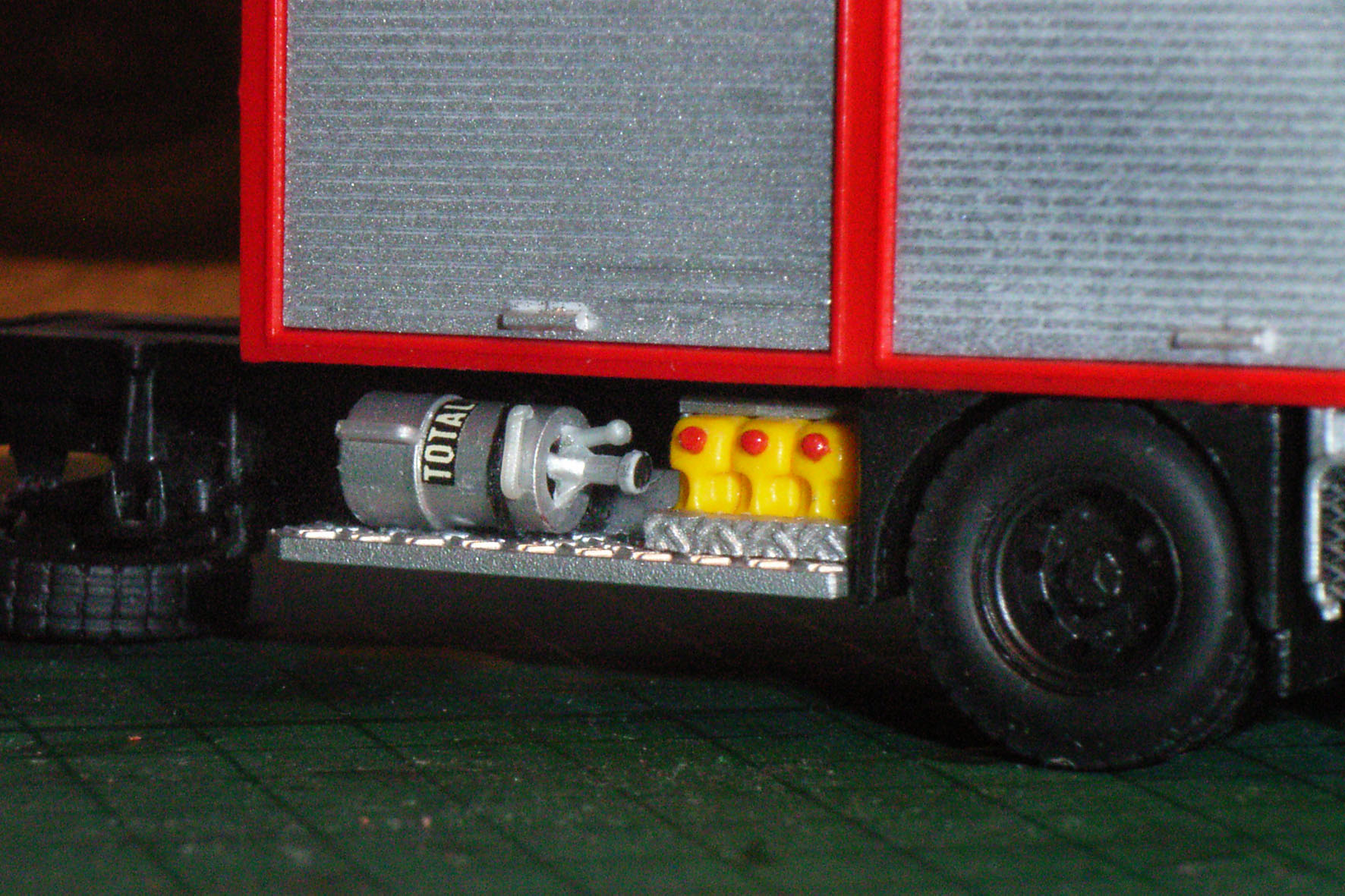 Immerhin ist die zweite Trittfläche nun auch bestückt: Drei Preiser-Schaummittelkanister und ein "leicht" aufgemotztes Herpa-Schaumrohr bilden zusammen mit den entsprechenden Halterungen die Beladung auf der linken Fahrzeugseite.