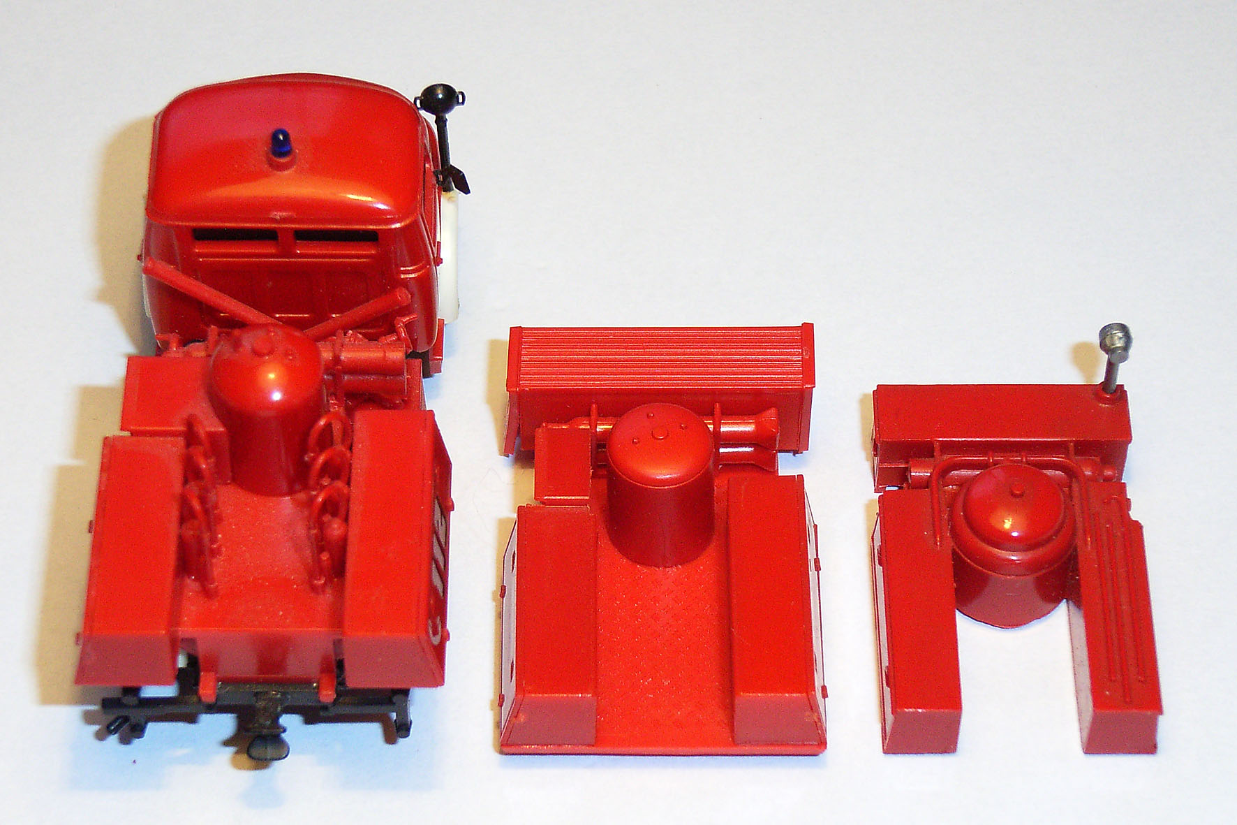 Verändert bzw. ergänzt wurden am Fahrgestell der hintere (jetzt kürzere) Überhang, der Trittbügel und die zwei Trittstufen am Heck, der Tankeinfüllstutzen, zwei Peilstangen, ein "Rohr" für den Arbeitsstellenscheinwerfer und die Nummernschildhalterung. Am Fahrerhaus wurden die Hauptscheinwerfer schon mal aufgebohrt, die Zapfwelle und ein aufgeständertes Blaulicht ergänzt und die Dachöffnung zwecks Aufnahme der Glaskuppel erweitert. Außerdem bekam die Inneneinrichtung noch ein freistehendes Speichenlenkrad und die Vorderräder einen Felgenauftrittsring.