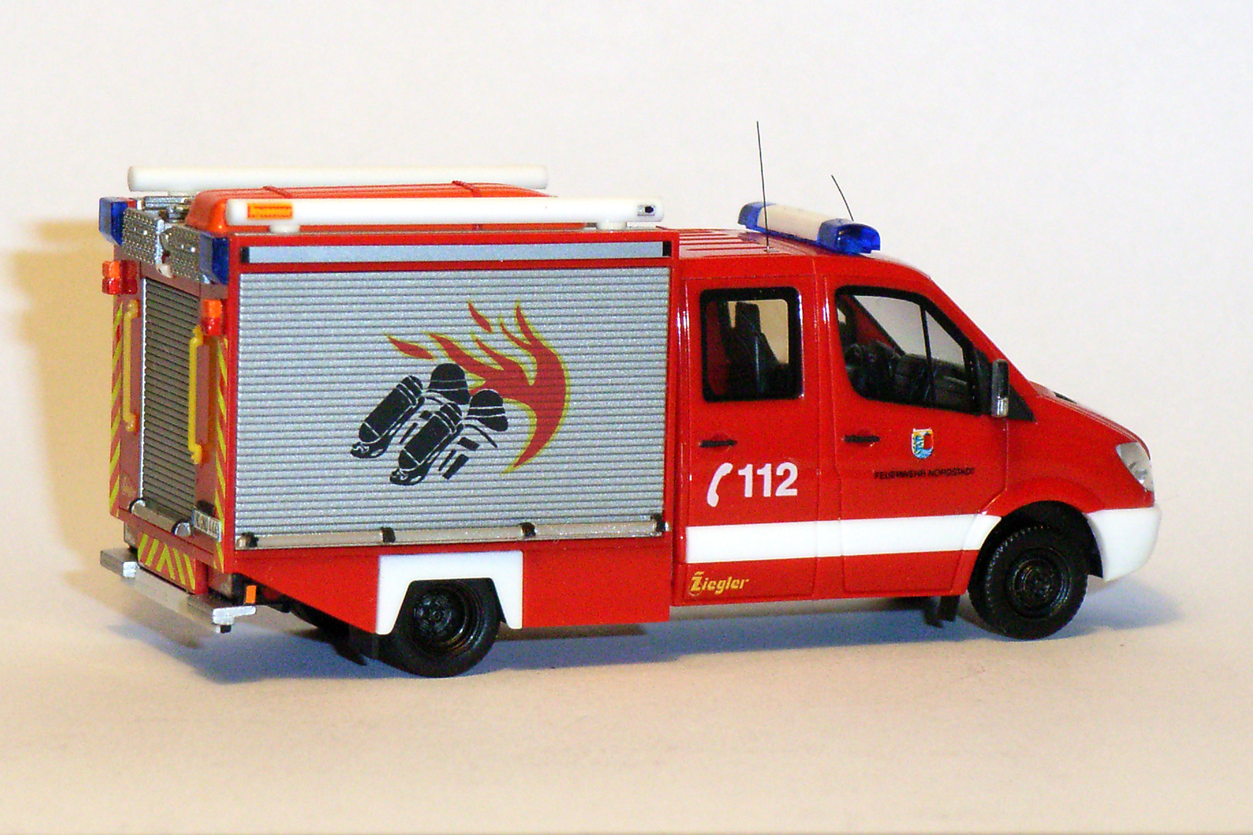 Hier wäre dann mal das erste Fahrzeug der Feuerwehr Nordstadt mit der o.g. "dekorativen Ganzkörper-Rolladenbeklebung":