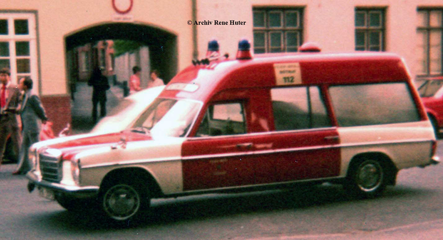 Hier geht es weiter mit einem Rettungswagen, der ursprünglich als KTW in Dienst gehen sollte. Da aber 1969 ein Unfallwagen auf Mercedes L 319 bei einer Einsatzfahrt verunfallte, wurde der KTW zum RTW umgerüstet und erhielt eine erweiterte Ausstattung. Es handelt sich um einen Mercedes 200/8 in hoch lang Ausführung. Lackiert war das Fahrzeug in RAL 3000 und in Weiß. Zusätzlich zu den Boschhörnern wurden auf dem RTW Presslufthörner montiert. Der RTW war auf Wache I stationiert und verrichtete seinen Dienst bis 1978. Es war der einzige RTW in dieser Ausführung bei der Feuerwehr Lübeck.