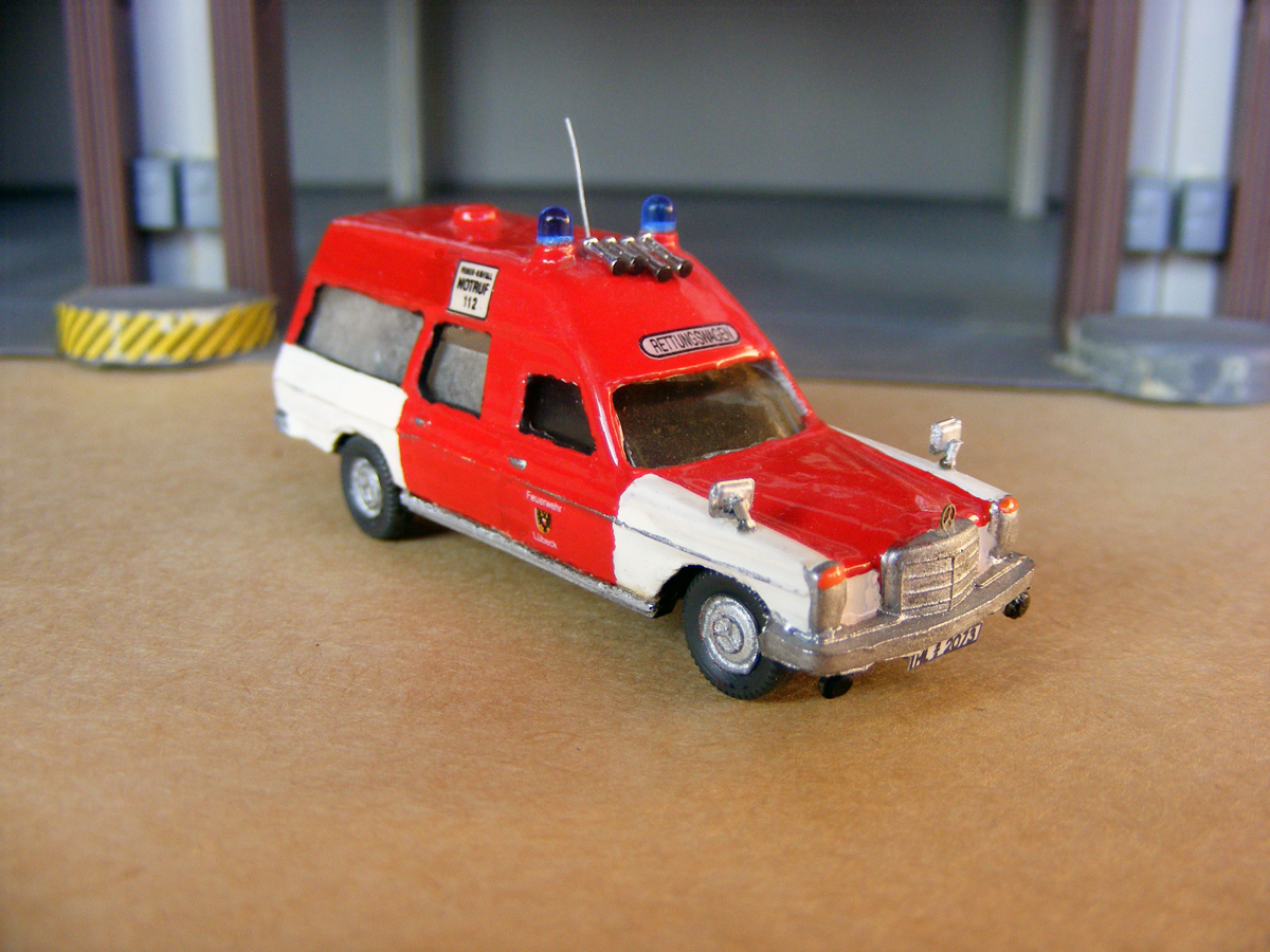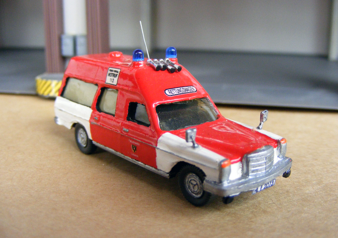 ich habe den hoch/lang RTW HL-2073 nochmal in die Werkstatt geholt. Das Fahrgestell ließ sich doch leicht abnehmen und ich habe die bemalten Heckfenster ausgetauscht und durch neue ersetzt, welche mit dem Schutzpapier von Decals beklebt wurde. Ich finde das sieht nun besser aus. Außerdem ist auf dem Kühlergrill wieder ein Mercedes Stern und der RTW bekam neue Spiegel. :wink: