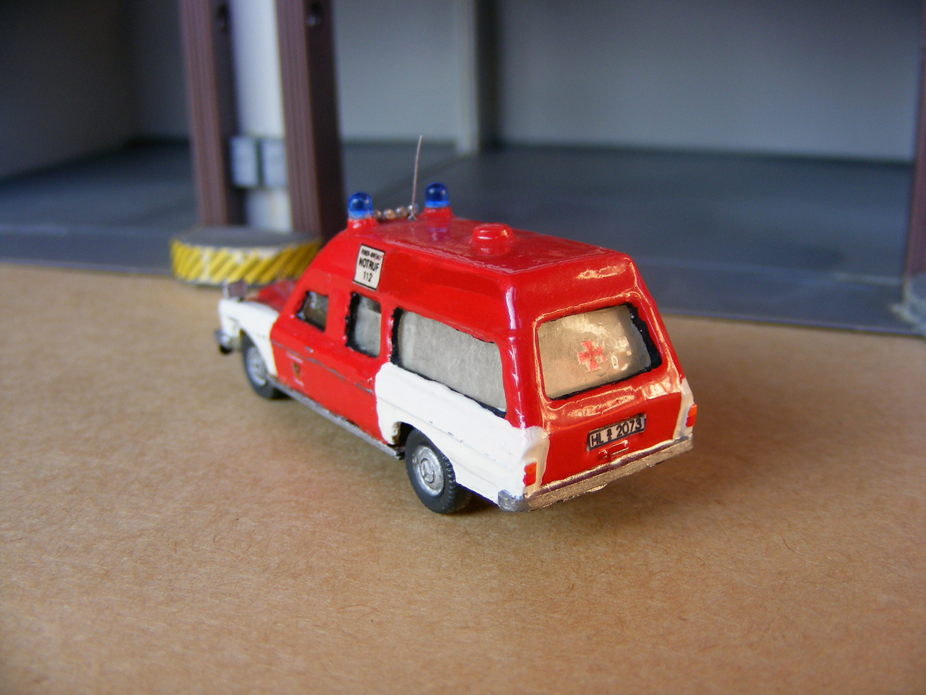 Das Basismodell lieferte Wiking. Da dieser RTW auch auf der Fahrerseite im Aufbau ein Fenster hatte, brauchte dies nicht verspachtelt werden. Die Lackierung erfolgte mit Humbrol Farben. Da ich zur damaligen Zeit noch keine Möglichkeiten hatte das Samariterkreuz darzustellen, habe ich ein normales Kreuz verwendet. Wenn ich diesen RTW nochmal auf Brekina baue, wird er auch das richtige Kreuz haben. Zusätzliche Kleinteile machen das Modell vollständig. Die Wiking Bereifung wurde durch eine von Herpa ersetzt. Auch dies Modell hat schon über 20 Jahre auf dem Buckel.