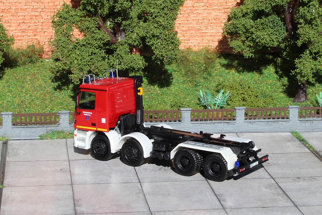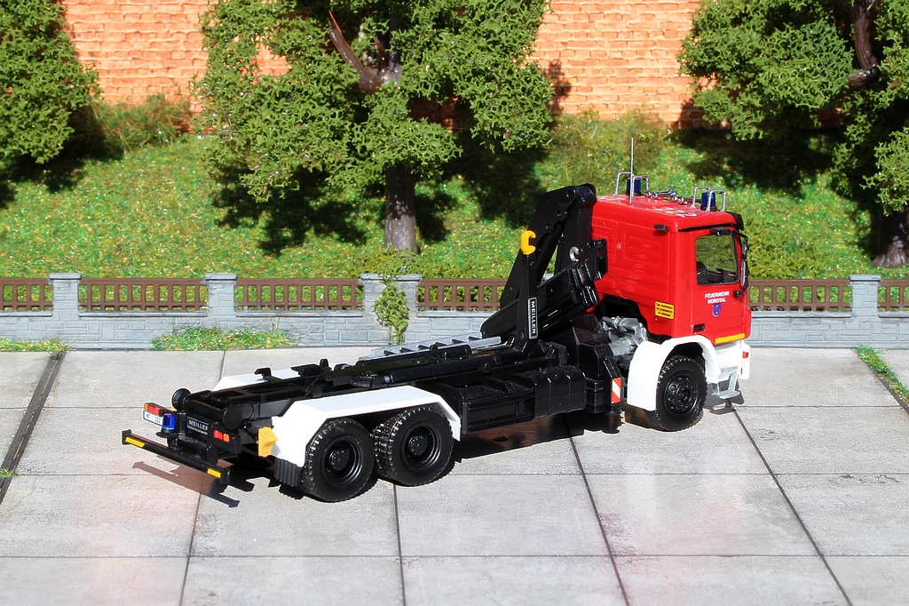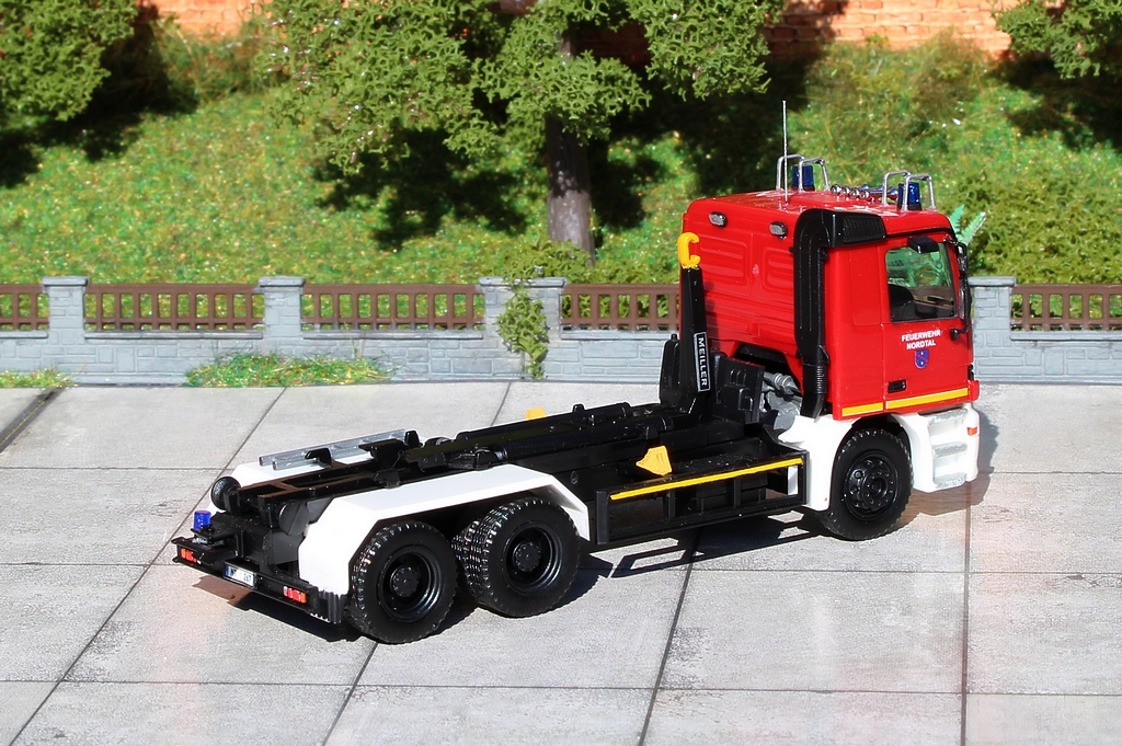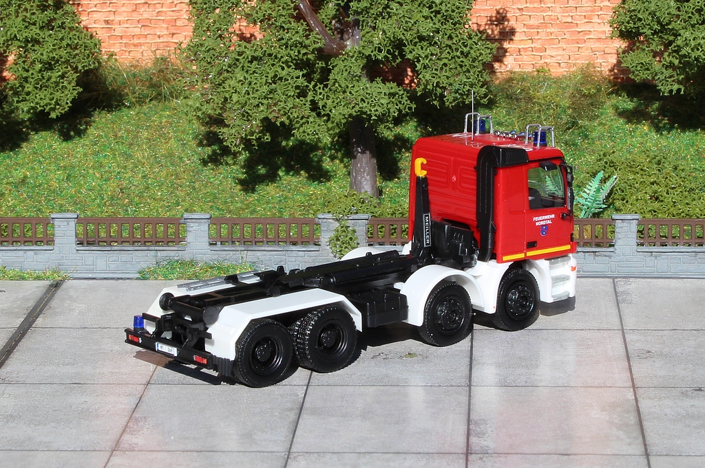 Das Modell kommt, wie auch das WLF 5, von Herpa und wurde mit verschiedenen Zurüstteilen, Decals und Farbtupfern „gesupert“. Der Abrollbehälter ist der allseits bekannte von Preiser.
