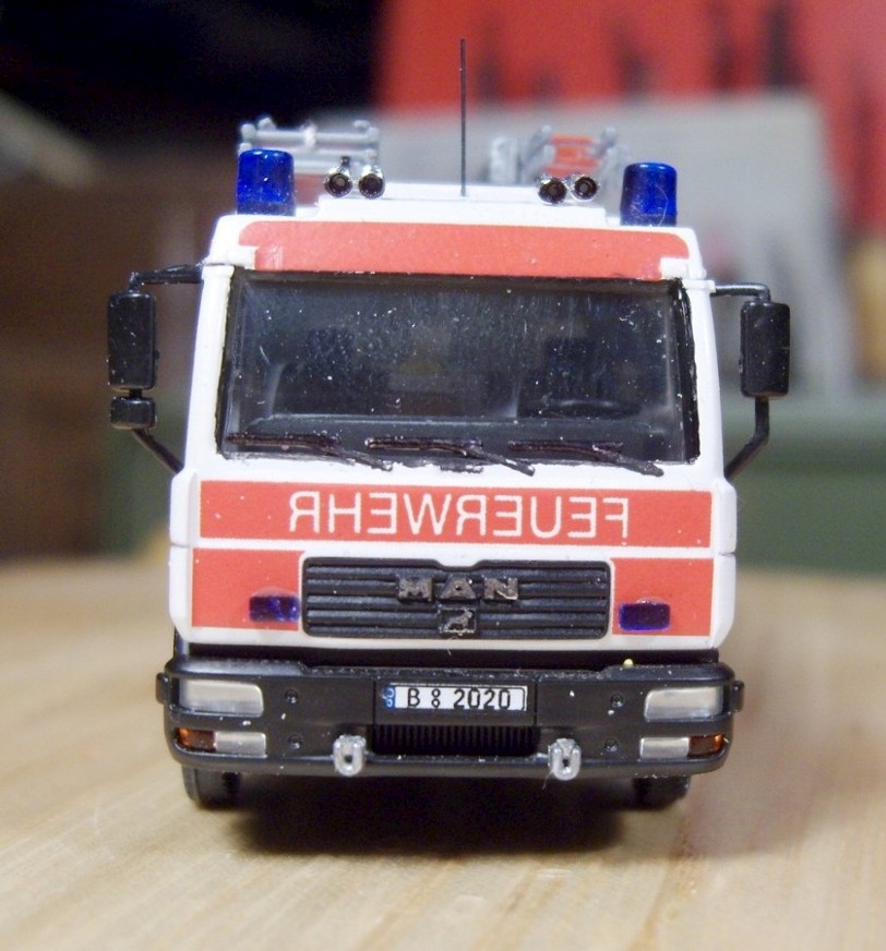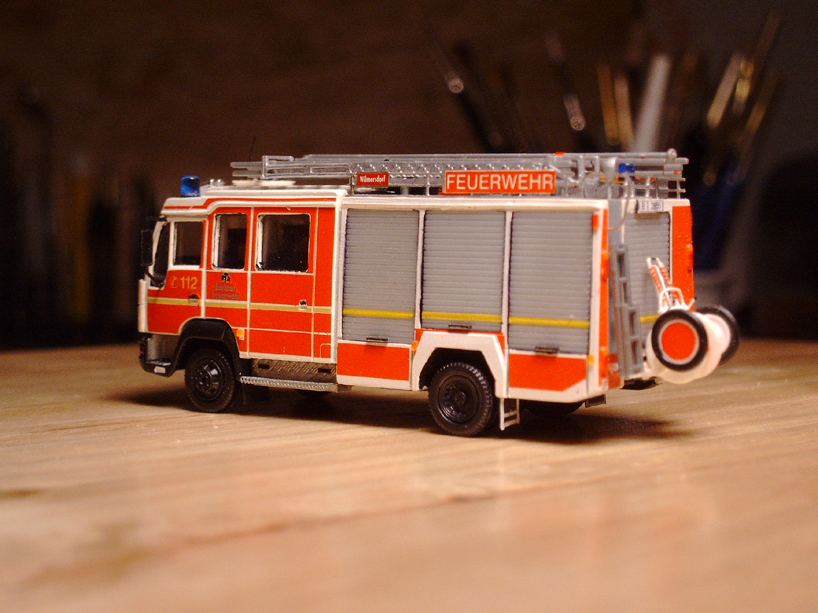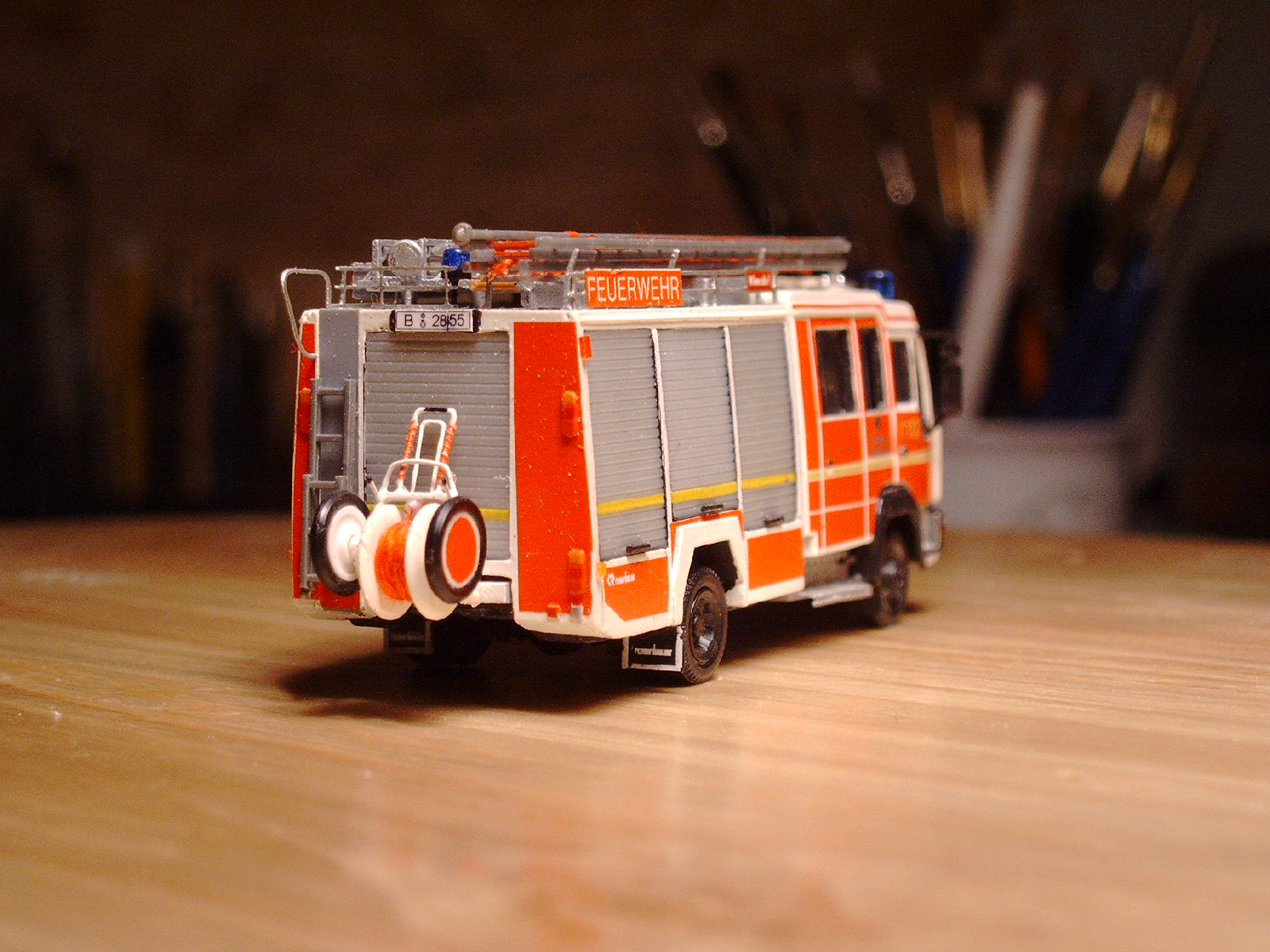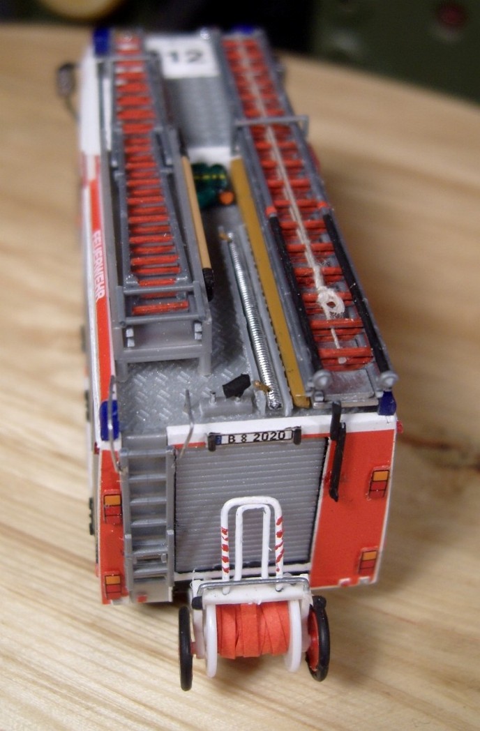 Lackiert mittels Sprühdose in weiss gänzend und dann mir Decals versehen. Die Rückleuchten für den LE Aufbau spendierte Rietze. Die (leeren) B-Schläuche auf der Haspel sind aus roter Bastelpappe geschnittene Streifen.