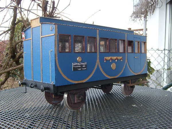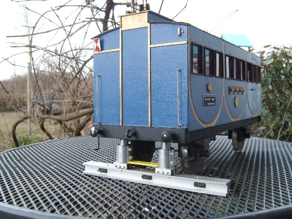 ja es ist richtig der Wagen ist ein kompletter Eigenbau aus Sperrrholz und lehnt sich an ein Vorbild des früheren bayrischen Hofzuges an. Diese Wagen waren zwar alle 3- achsig (wie auch dieses Modell, was ursprünglich mal eine Schaufensterdeko war). Zur Simulation des Eingleisens ist die dritte Achse aber sehr hinderlich, weil der gesamte Wagen sonst so stark angehoben werden muss, das auch die mittelere Achse über die Schienen gehoben werden kann. Also wurde die Achse demontiert.