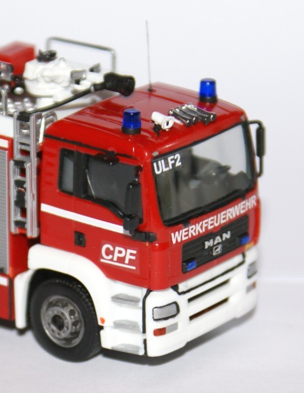 Herzstück ist ein Alco-Werfer von Preiser. Dieser wurde mit runden und eckigen Profilstücken, einer Scheibe (Seitenteil einer tragbaren Schlauchhaspel) und einem neuen Rohr ergänzt. Vorbild soll der Python-Werfer mit Fernbedienungsmöglichkeit aus dem Hause Ziegler sein. Am Rohr selbst wurden neben Rietze Scheinwerfern im vorderen Bereich zwei verschiedene Blaulichtsockel (gerades Stück-Roco und konisches Stück-herpa) angebracht, die zusammen mit kleineren Rundprofilen (Abgasrohre von Preiser Magirus Haubern) nun eine Williams HydroChem-Düse darstellen sollen. Der Schlauch zur Düse ist die Pulverzuführung.