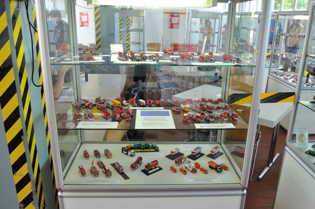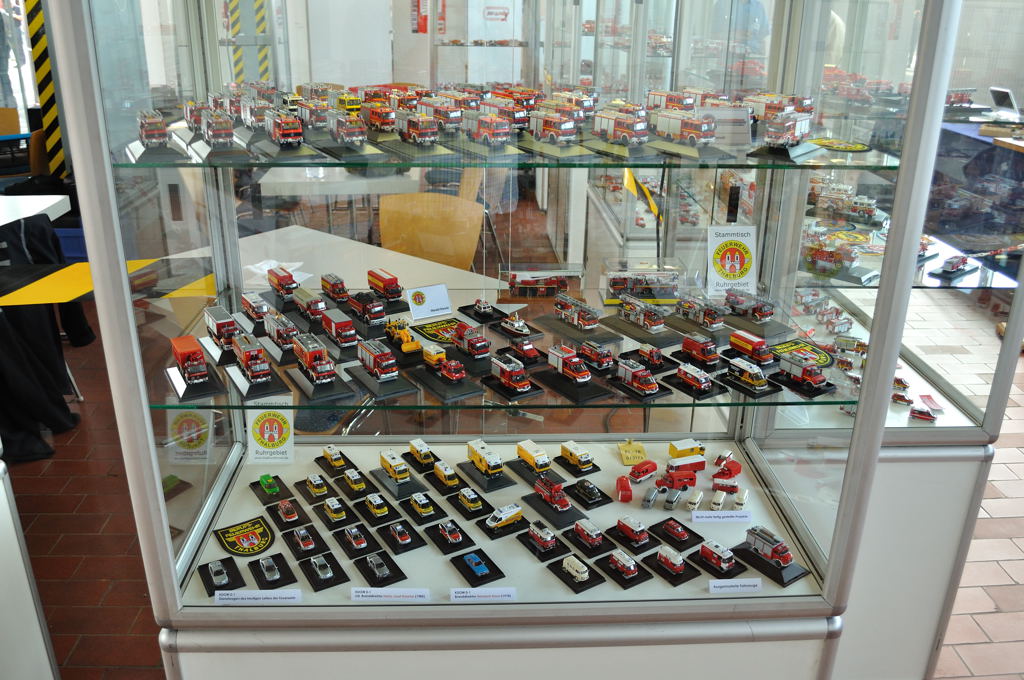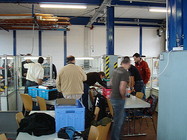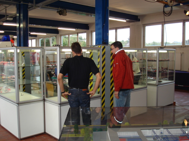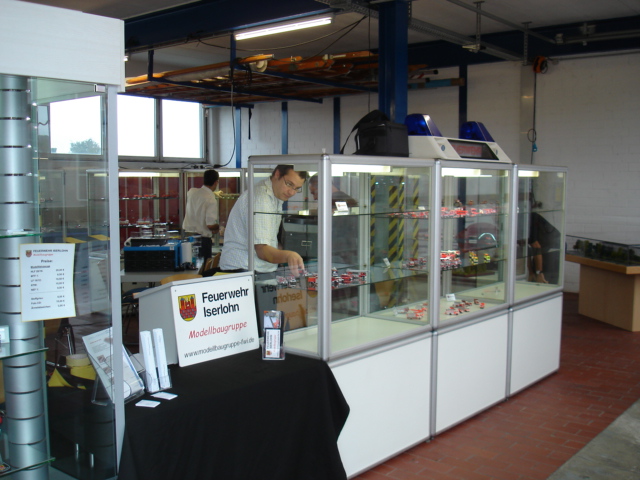 Die Nacht verlief sehr unruhig und schmerzhaft, denn wie in einer Jugendherberge üblich, hatte das Bett kein Lattenrost sonder eine ziemlich deformierte Pressspanplatte - für Kreuzgeschädigte die absolute Hölle, so dass ich die "Nachtruhe" um ca. 3:00 beendete - bis 6:30 Uhr wartete ich und der Tag begann mit einer warmen Dusche. Es folgte ein gemeinsames Frühstück mit Jürgen - der auch ein Jugendherbergserlebnis verbuchen konnte. Gisbert hingegen hatte die Präsidentetage mit sämtliche Luxus. Aber alles das hielt uns nicht davon ab das dies ein schöner Tag werden sollte und es wurde auch einer. Angekommen bei der BF Iserlohn, waren bereits die anderen Mitaussteller eingetroffen, die mit teilweise etwas verkniffener Miene - wegen einem eventuell vorhandenen Zeitdruck - ihre Vitrinen einräumten. Das sah dann so aus: