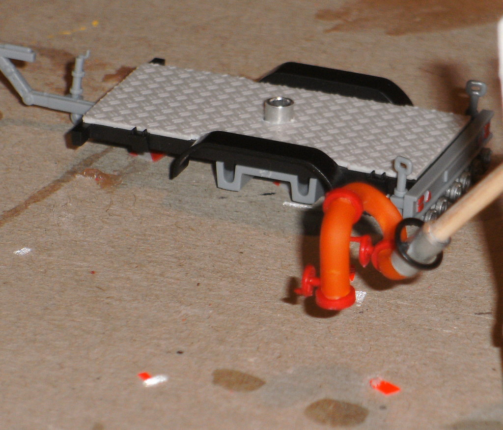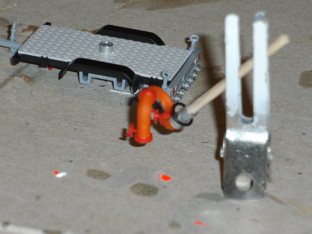 Der Werfer wurde aus alten Gießästen gebogen.Die Flansche dazwischen sind Blaulichtsockel von Roco.Das Endstück ist ein Aluröhrchen.Der Griff darum ein altes LKW-Lenkrad.
