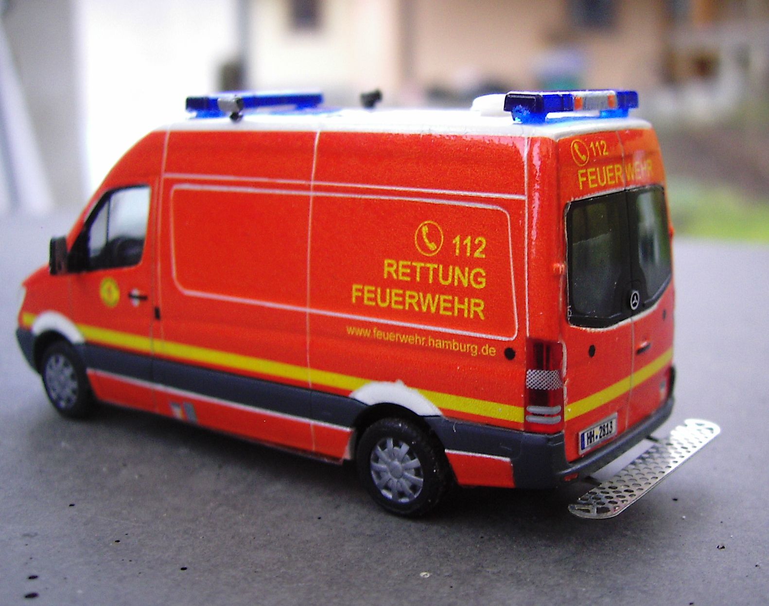 Grundmodell herpa , Decals ? ( auf einer Börse aufgegabelt ) , Blaulichtbalken und Trittbrett RMM , die Scheinwerfer von Roco und die Tröten von herpa .