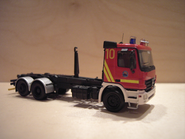 Kabine MB ACTROS (Bauversion) aus dem Herpa Teileshop. Fahrgestell ebenfalls aus dem Herpa Programm. Dieverse Teile an der Kabine wie Antennen, Astabweiser und Fanfaren habe ich schon angebracht. Ein Paar Teile sind bestellt um dieses Fahrzeug fertig zu stellen.