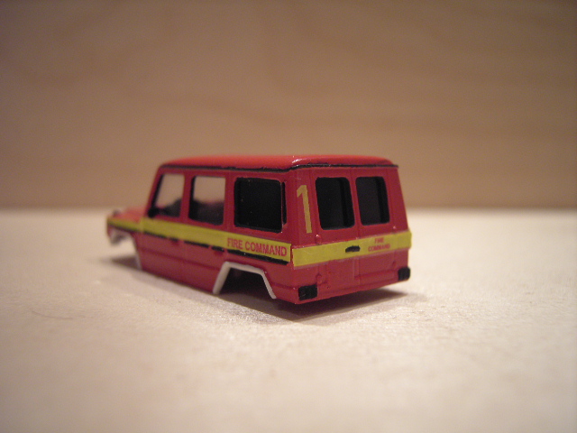 Basismodell war ein MB G-Modell von Wiking. Das Modell habe ich vorsichtig zerlegt und die Karosse in RAL 3000 lackiert. Die hinteren Scheibe habe ich geschwärzt. Die obere Reling habe ich mit einem EDING nachgezogen. Is sauberer als mit dem Pinsel