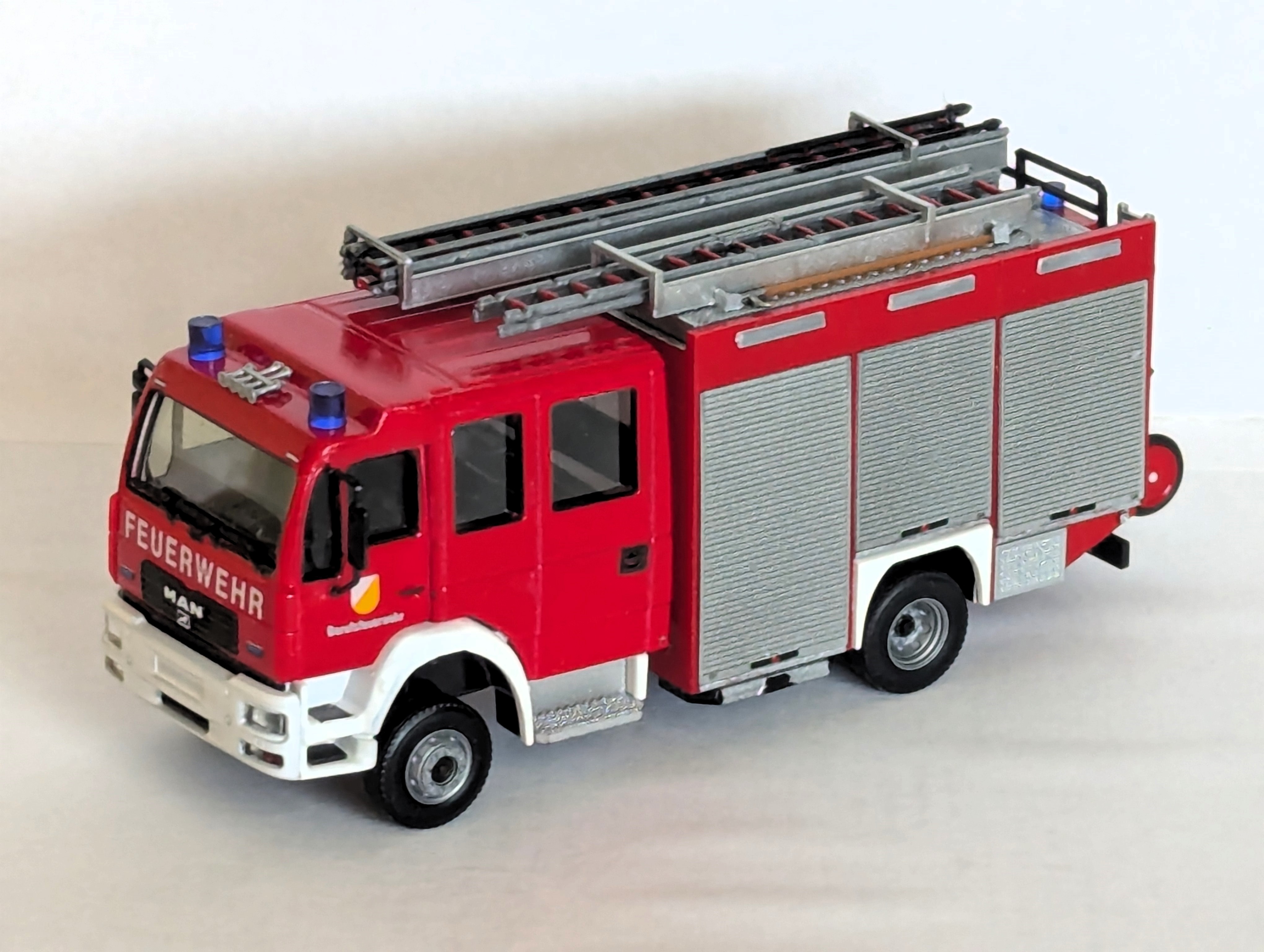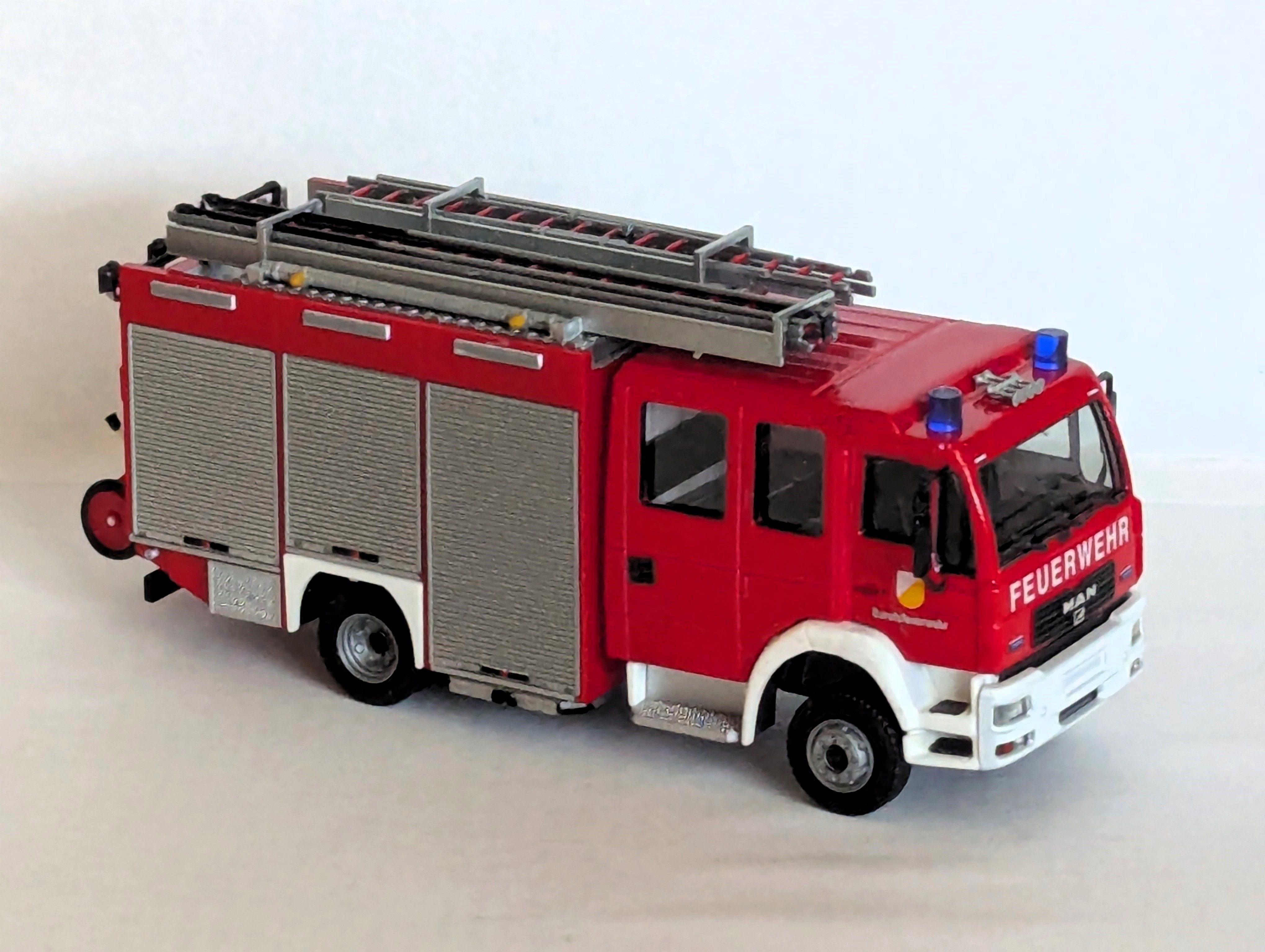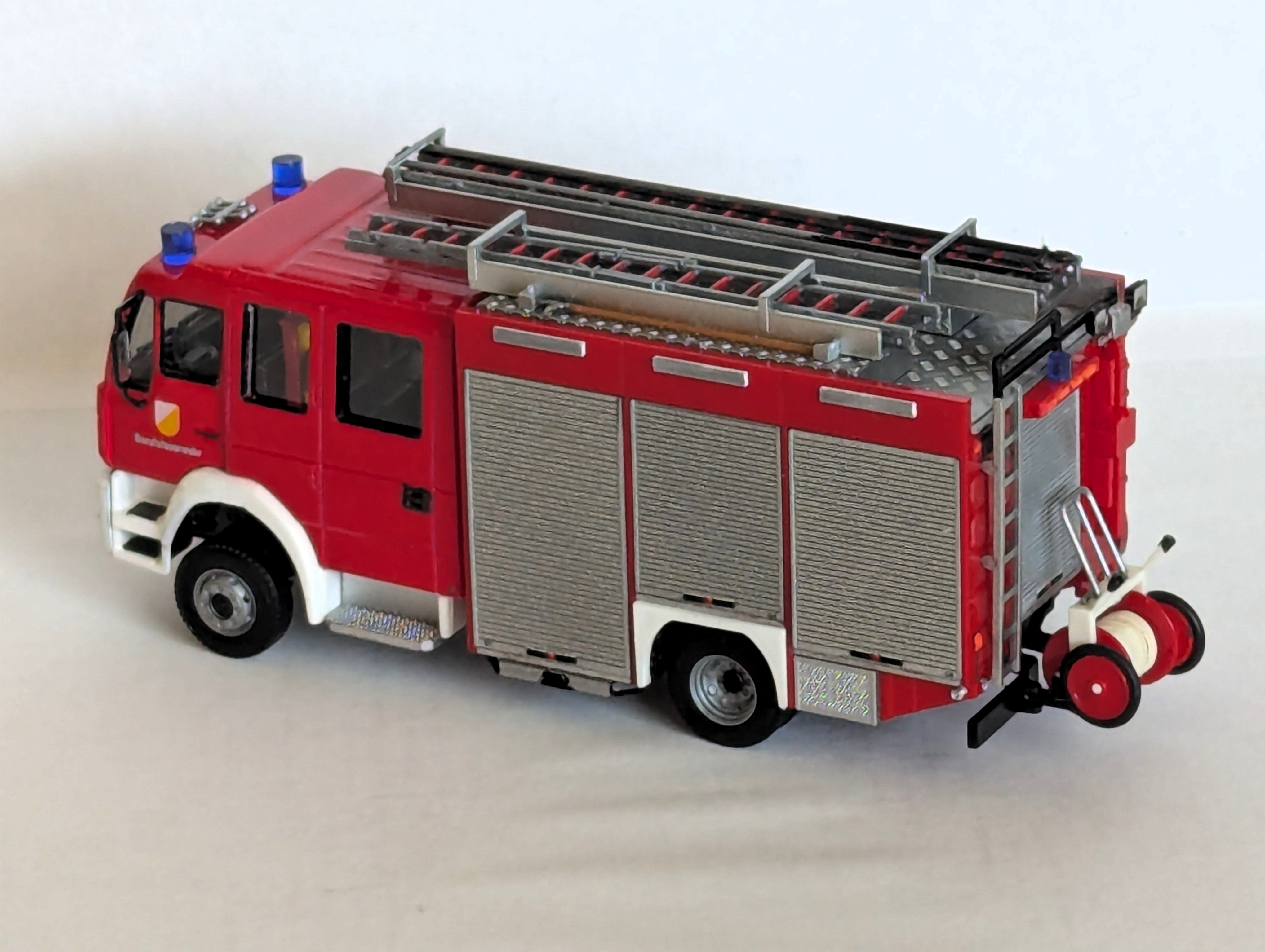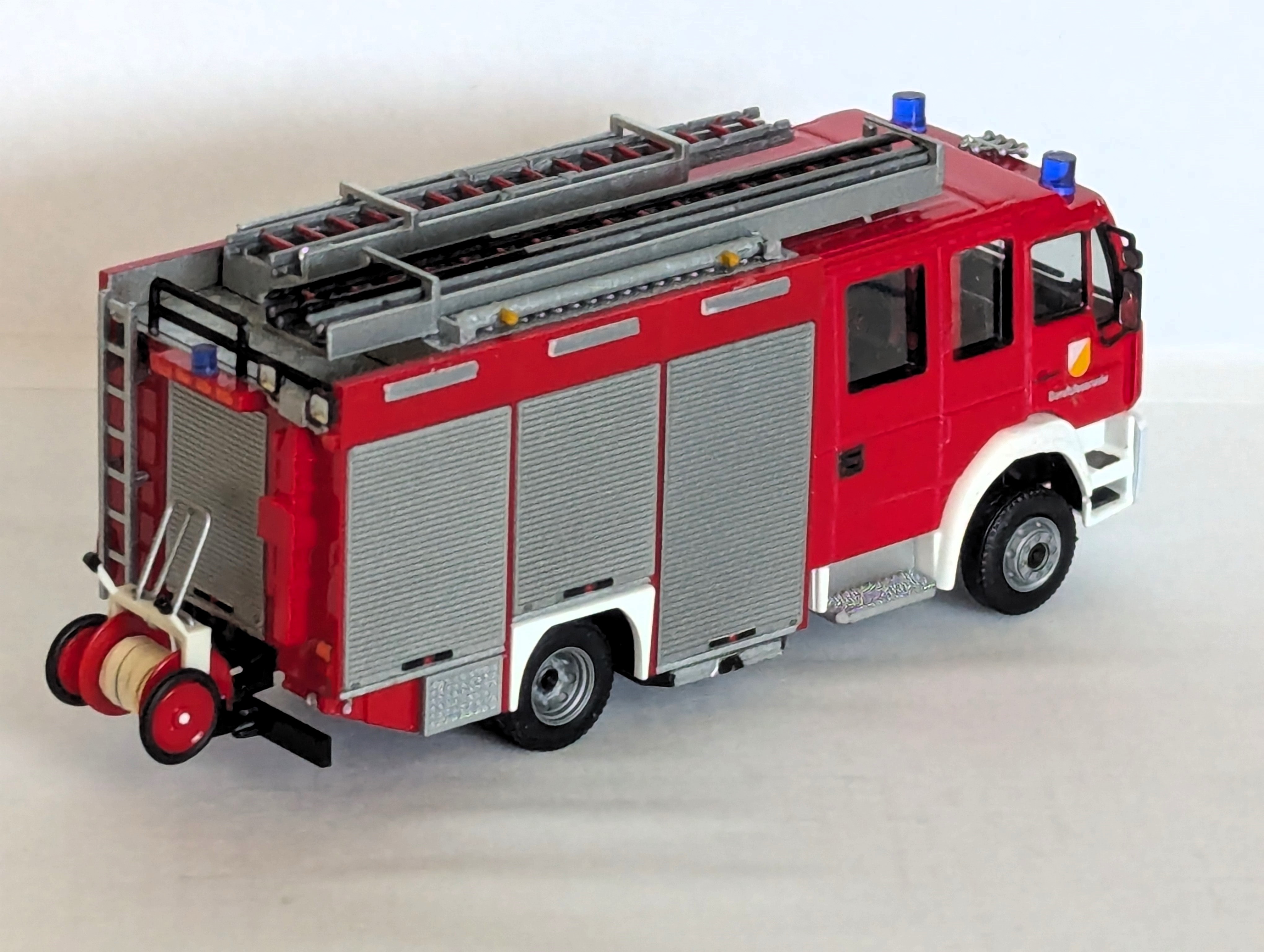 Dem Modell stand das LF 16/12 der Freiwilligen Feuerwehr Hofgeismar Pate. Ausgangsbasis bildet ein Rietze Eurofire LF 16/12 und ein herpa MAN LE Fahrerhaus. Mittels Tischkreissäge wurde das Iveco Fahrerhaus und die MAN Rückwand entfernt, so dass beide Kabinenteile unmittelbar hinter den Fahrerhaustüren zusammengefügt werden konnten. Das Dach des MAN Fahrerhauses wurde zuvor abgeschliffen; mittels Polystyrol-Platten und Spachtelmasse entstand ein neuer Dachaufsatz und Übergang zum Mannschaftsraum. Anschließend konnten die vorderen Kotflügel des MAN und der hintere Teil des Iveco zusammengefügt und verspachtelt werden. Der Rest ist trivial: nach dem Lackieren folgte das übliche Finish mit Kleinteilen und Decals aus der Krabbelkiste. Hier noch Bilder aus der Bauphase: