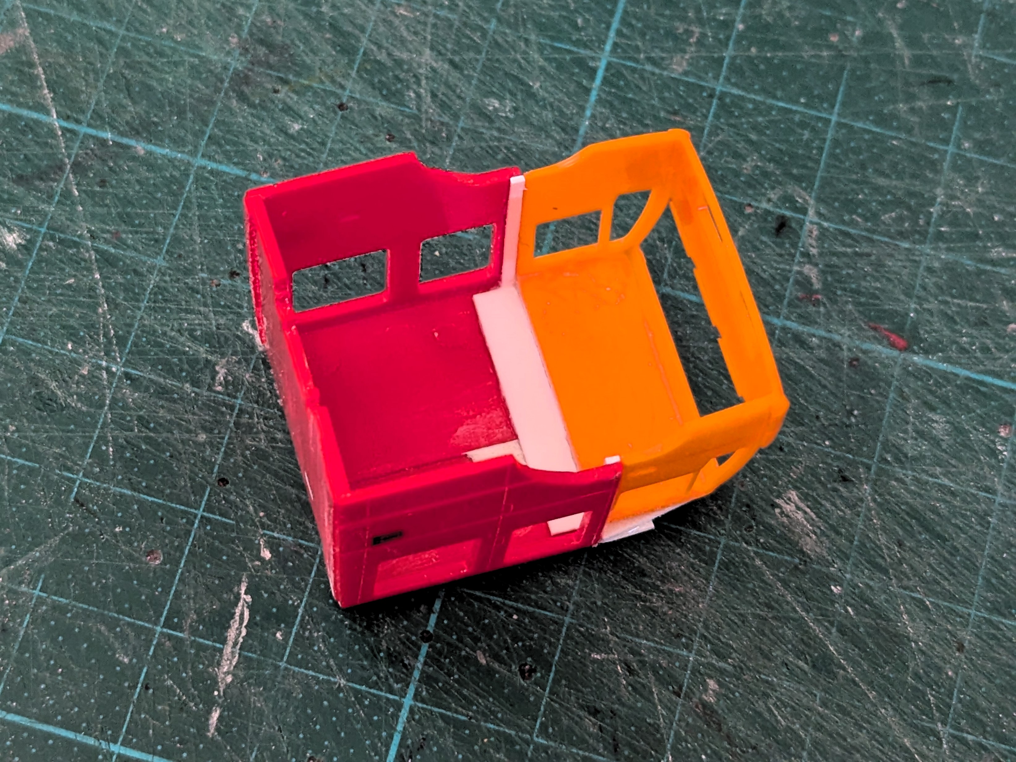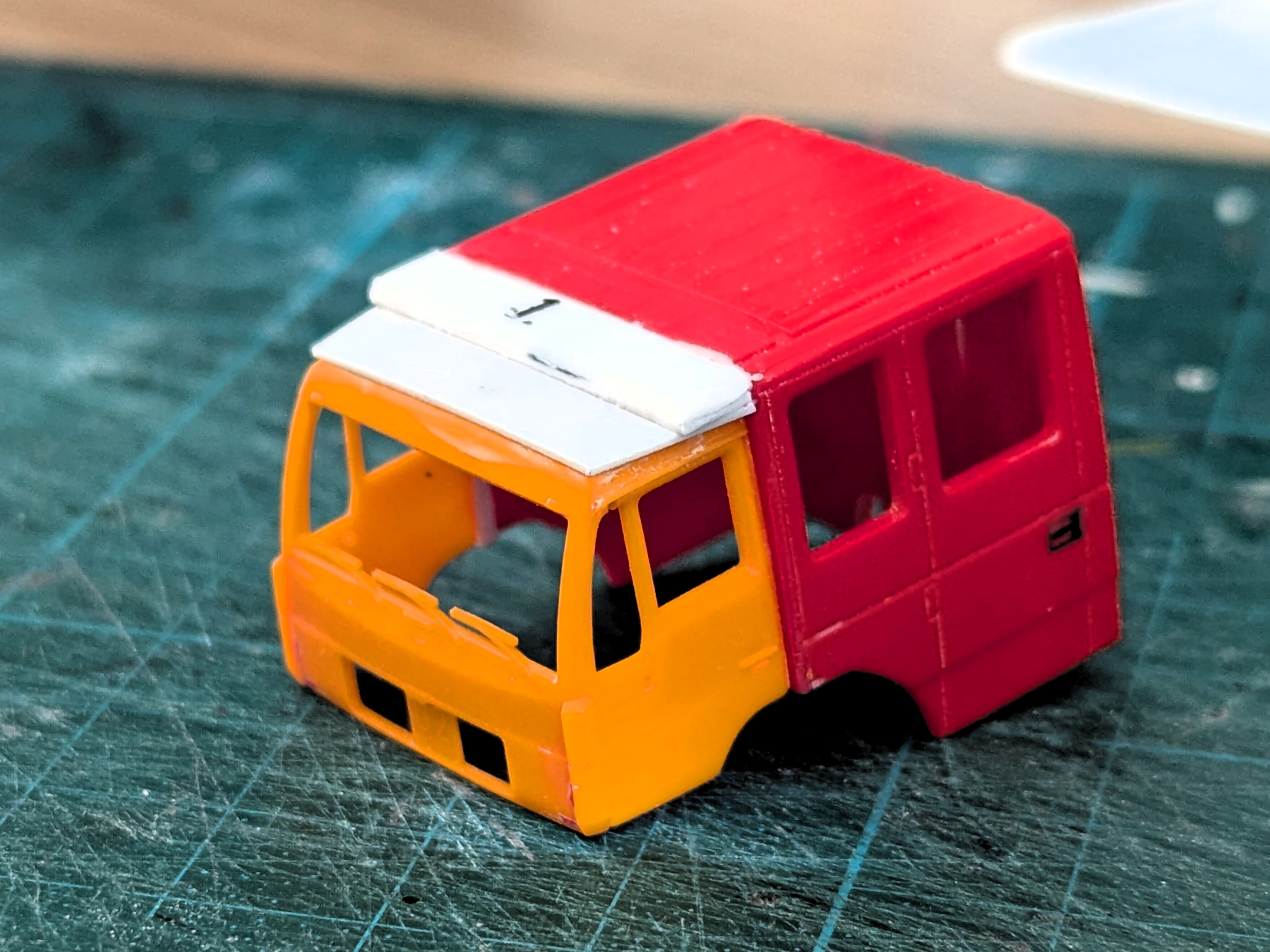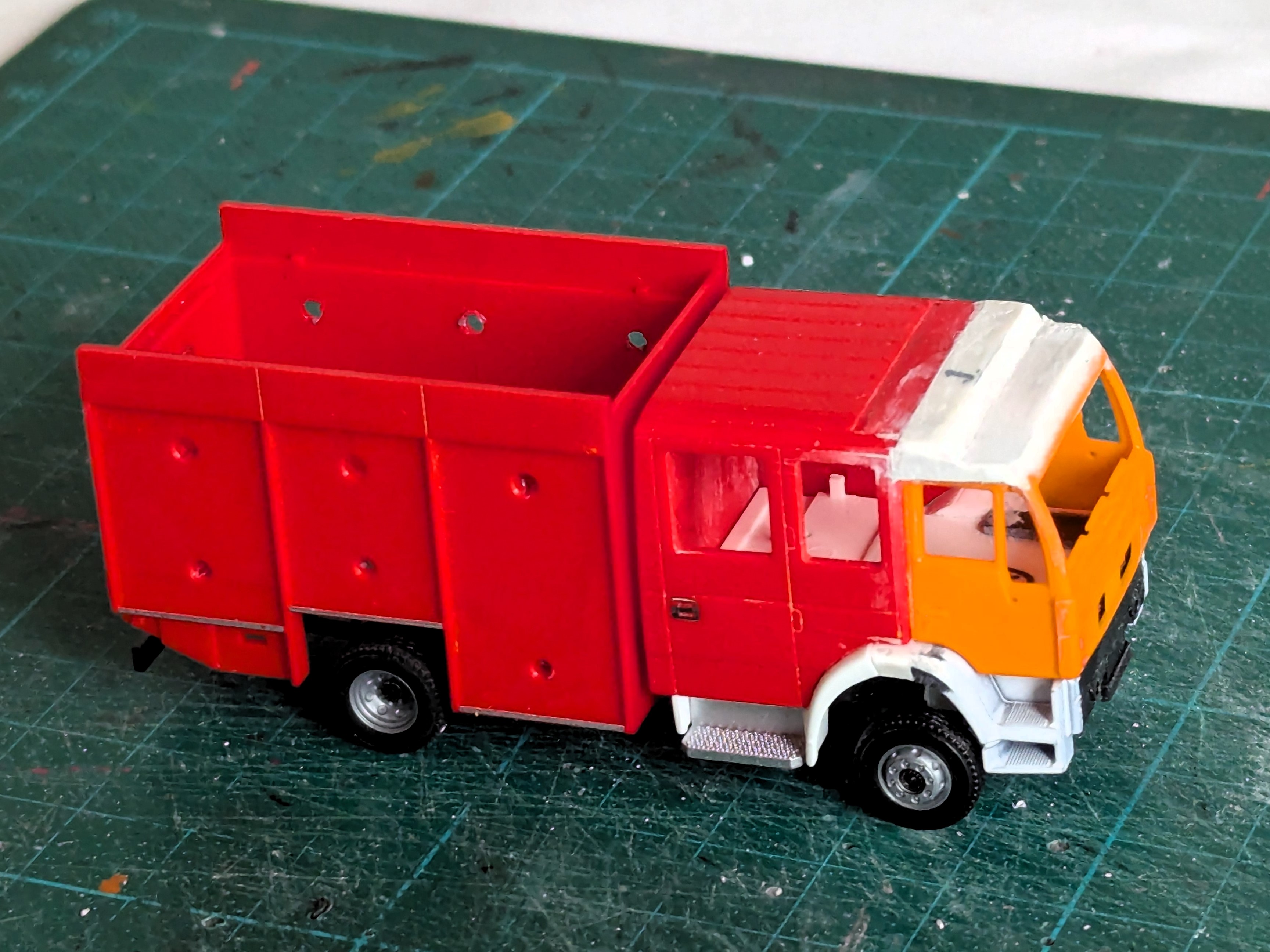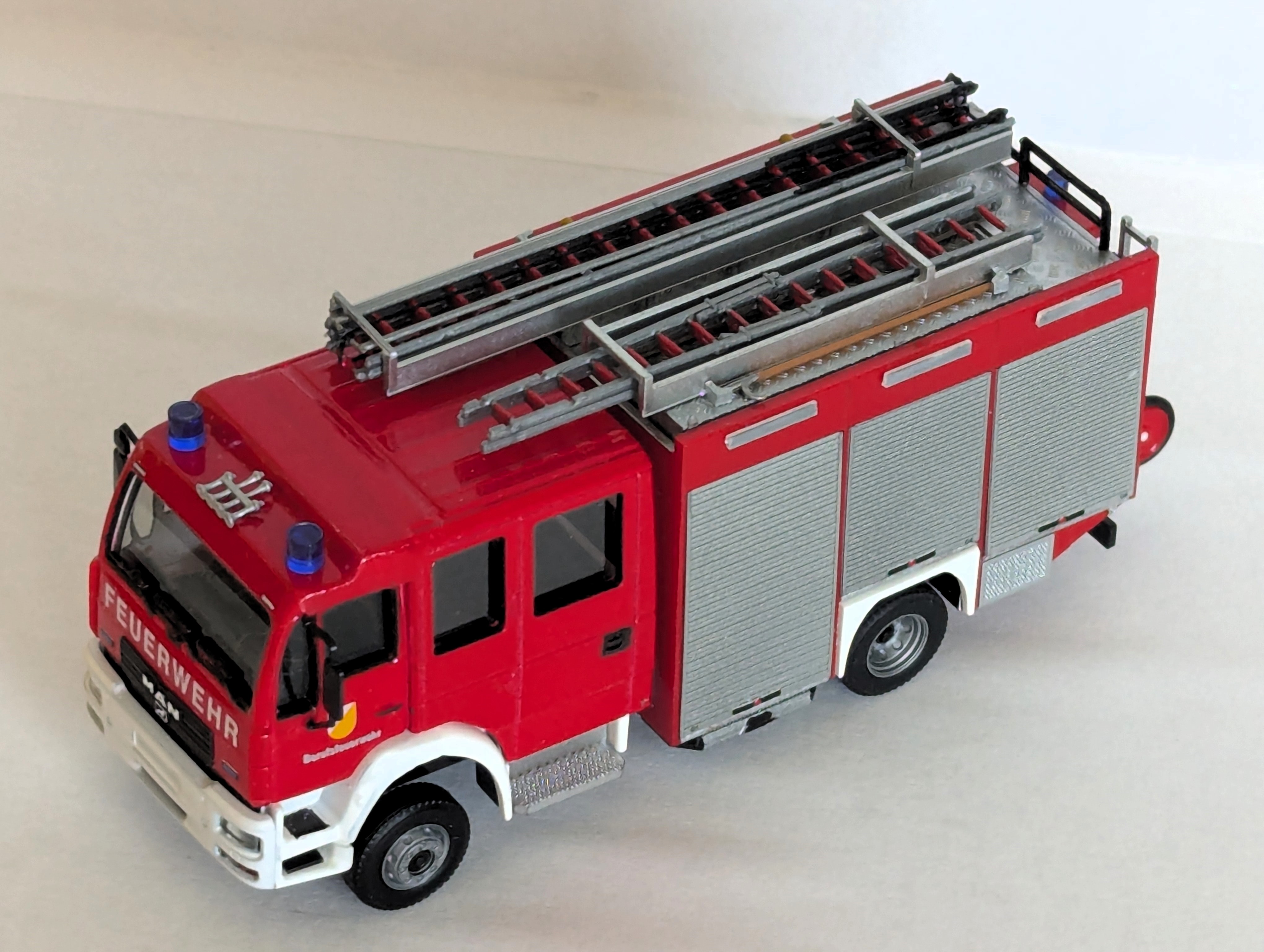 Dem Modell stand das LF 16/12 der Freiwilligen Feuerwehr Hofgeismar Pate. Ausgangsbasis bildet ein Rietze Eurofire LF 16/12 und ein herpa MAN LE Fahrerhaus. Mittels Tischkreissäge wurde das Iveco Fahrerhaus und die MAN Rückwand entfernt, so dass beide Kabinenteile unmittelbar hinter den Fahrerhaustüren zusammengefügt werden konnten. Das Dach des MAN Fahrerhauses wurde zuvor abgeschliffen; mittels Polystyrol-Platten und Spachtelmasse entstand ein neuer Dachaufsatz und Übergang zum Mannschaftsraum. Anschließend konnten die vorderen Kotflügel des MAN und der hintere Teil des Iveco zusammengefügt und verspachtelt werden. Der Rest ist trivial: nach dem Lackieren folgte das übliche Finish mit Kleinteilen und Decals aus der Krabbelkiste. Hier noch Bilder aus der Bauphase: