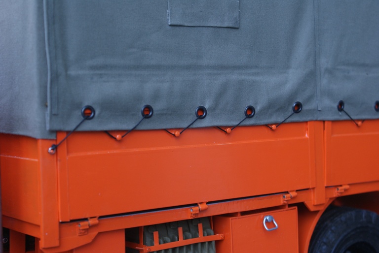 Zur Befestigung der Plane wurden noch Ösen angebracht und eine passenden Schnur eingefädelt. Die Ösen sind eigentlich viel zu groß. Müssen aber so sein, weil am Anfang und Ende der Schnur jeweils ein Ring zum Einhängen in die Pritschenhaken ist , der noch durch die Ösen muss.