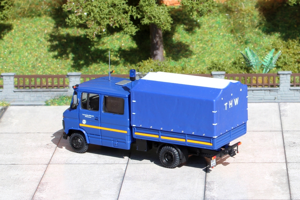 Das Fahrgestell spendierte ein LF 16 und wurde auf einen Originalradstand von 3200 mm gekürzt. Anbauteile wie Batteriekasten, Druckluftkessel, Schmutzfänger usw. wurden nach Vorbild ergänzt. Das THW Fahrzeug erhielt für seinen Einsatz zusätzlich eine blaue Rundumkennleuchte, eine Abschleppstange vorne unterhalb der Pritsche und einen Staukasten vorne rechts an der Bordwand. Die Räder stammen von Busch.