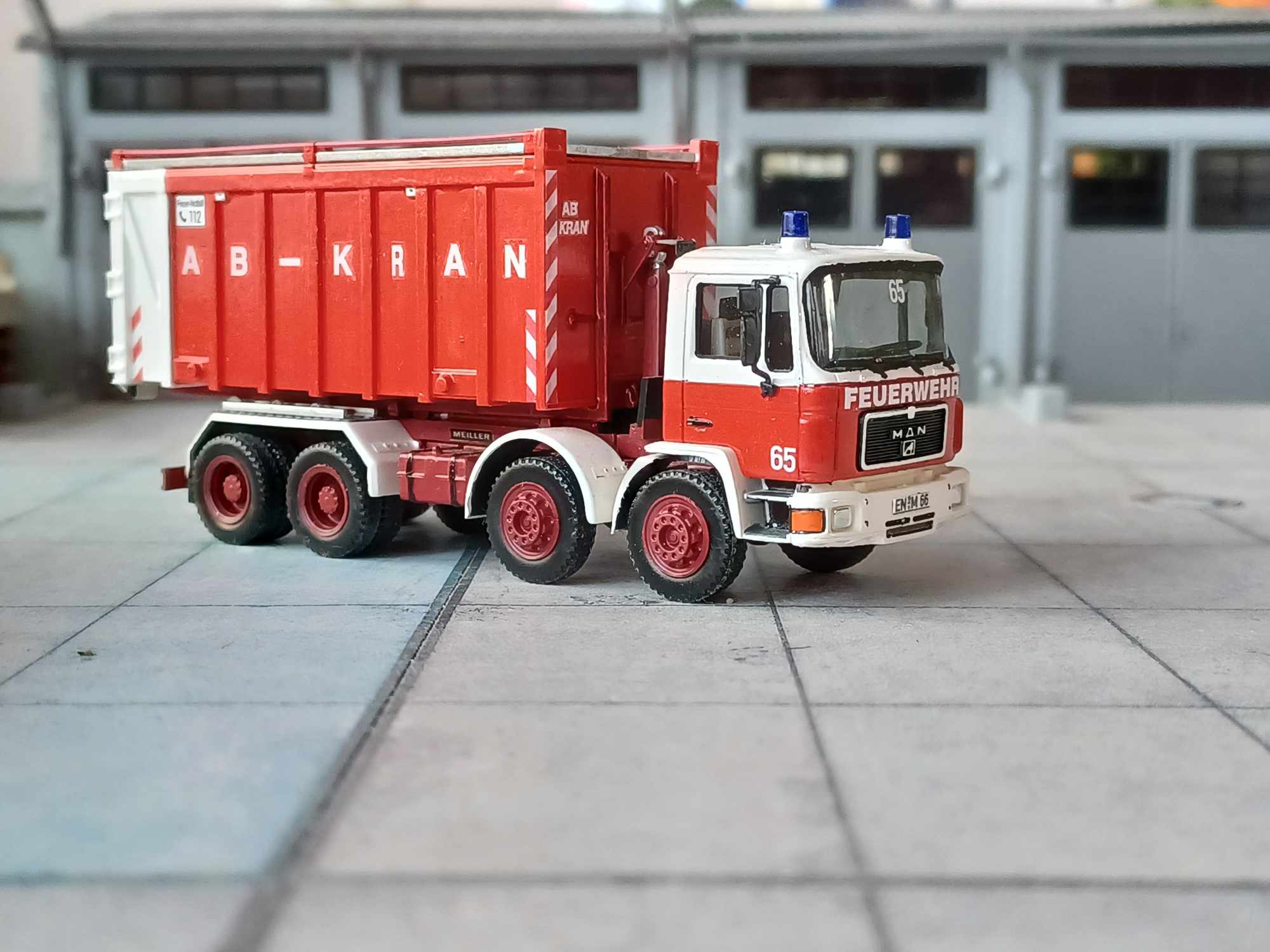 um im Einsatzfall für den Kranwagen das passende Zubehör und Material zu haben, beschaffte man 1999 zusatzlich zum Gerätewagen-Kran einen Abrollbehälter-Kran. Dieser basiert auf dem Müllbehälter der Rhätischen Bahn (ACTS-System). Der Behälter stammt vom Hersteller Werner & Weber GmbH. Die Entnahme kann von hinten oder von oben erfolgen. Das Modell ist von Bemo und wurde neu lackiert und mit Decals versehen