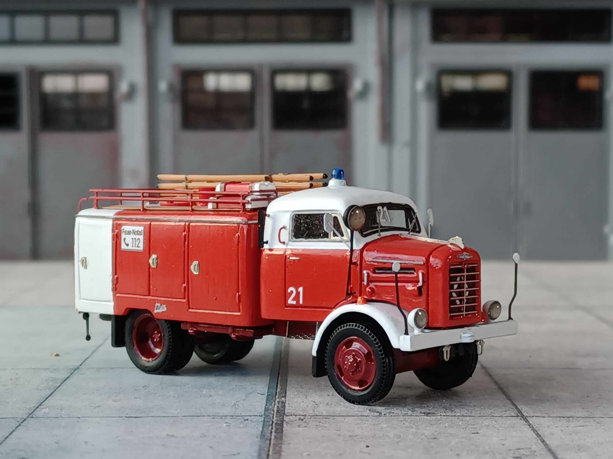 Mercedes-Benz 1222 AF/36, Löschgruppenfahrzeug LF 16/12, Aufbau Bachert Modell ist ein Bausatz K&B welcher neu lackiert wurde und mit Kleinteilen und Decals versehen.
