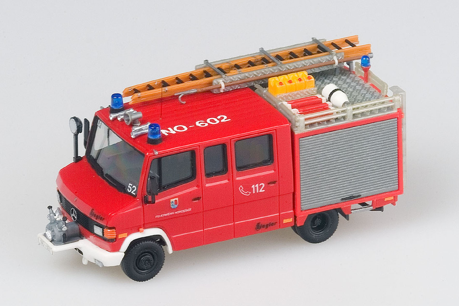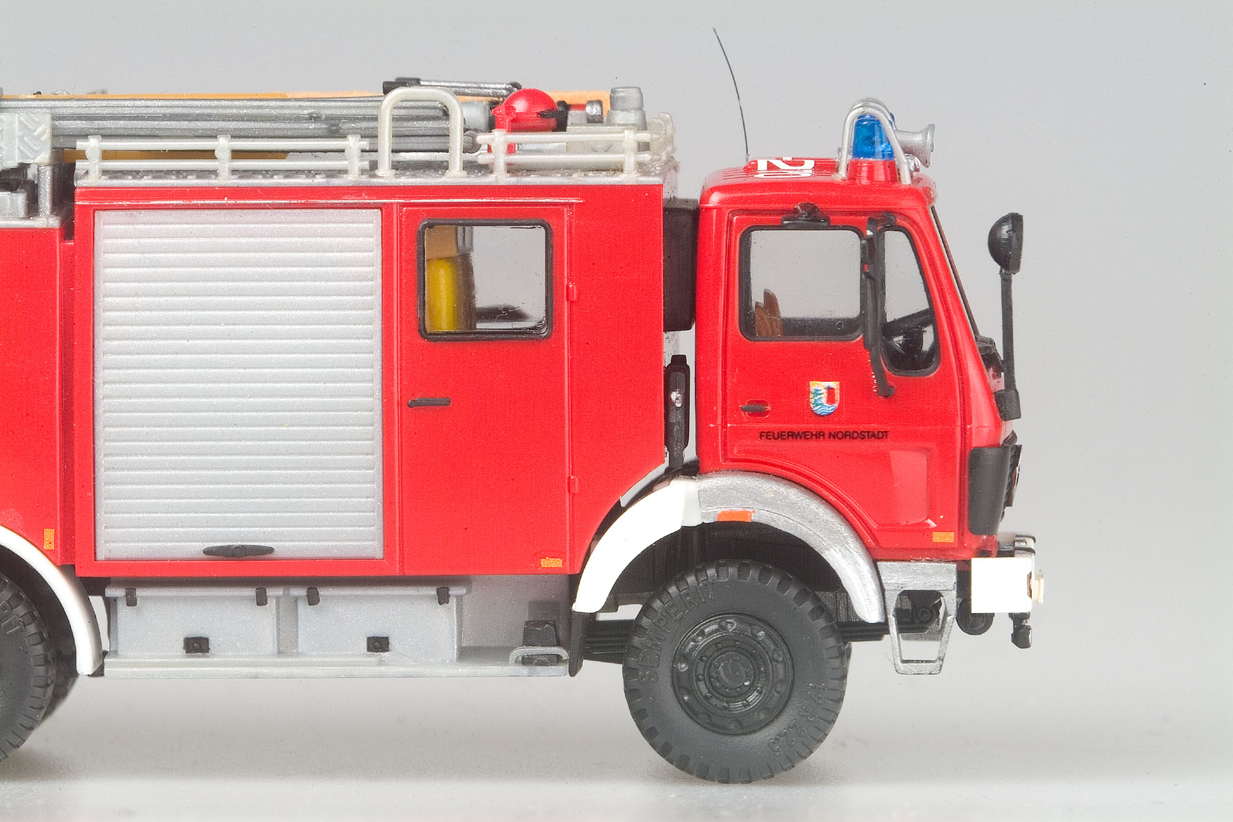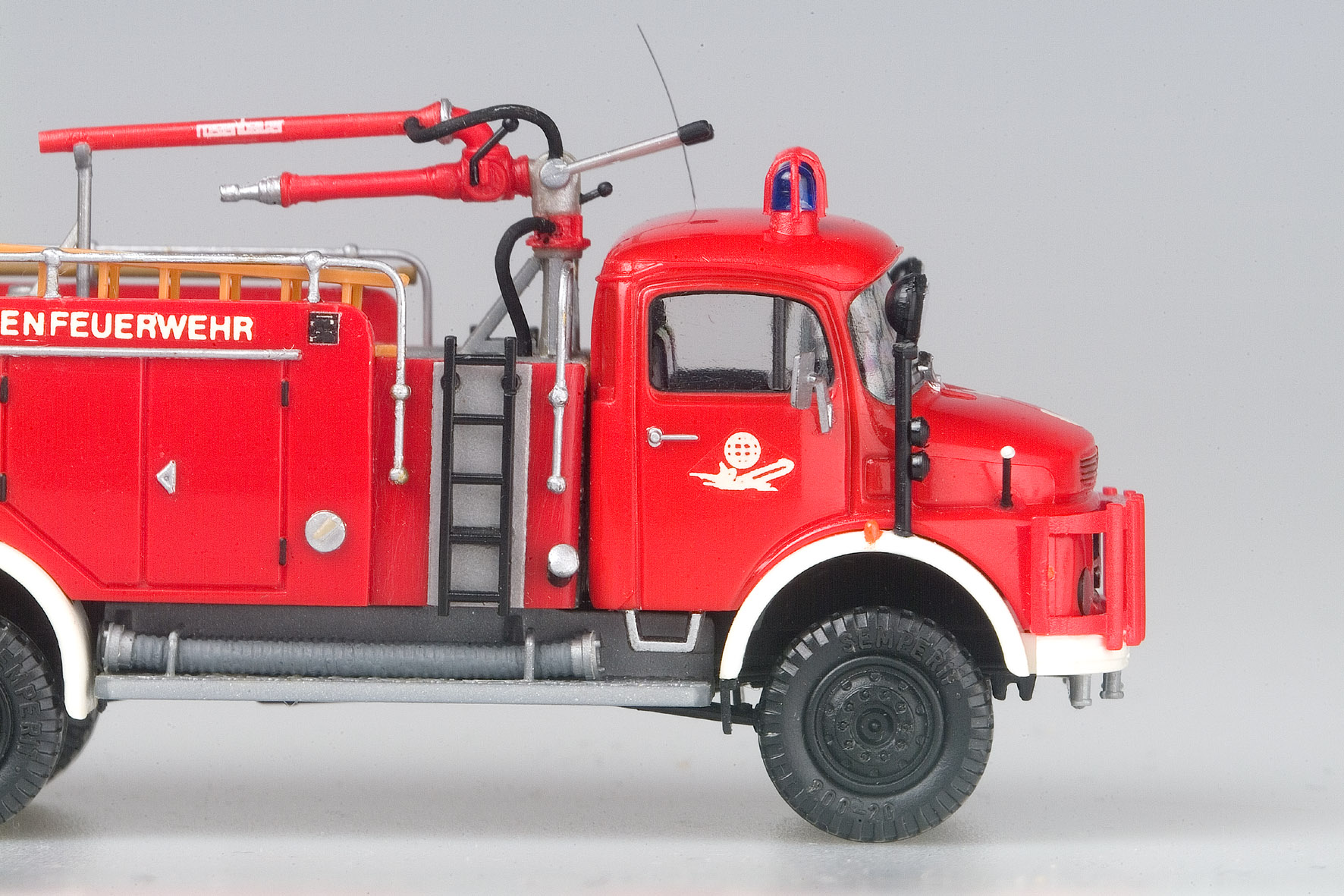 Die Länge des Fahrgestells orientiert sich jetzt logischerweise am halben Roskopf-Koffer; nach dem Zersägen des Chassis und der damit verbundenen Kürzung um ca. 12,5 mm wurde das neue Fahrgestell unter Verwendung einiger stützender Profilteile gemeinsam mit dem Aufbau montiert. Wie schon das LF 51 wurde auch das Fahrzeug der FF Saalfeld mit einer Preiser-Dachfläche versehen und mittels diverser Zubehörteile ausgerüstet. Bleibt zum guten Schluss noch der Hinweis, dass die Vorbaupumpen für die LF 8 der Freiwilligen Feuerwehren in Nordstadt grundsätzlich von der Firma Roco geliefert wurden.