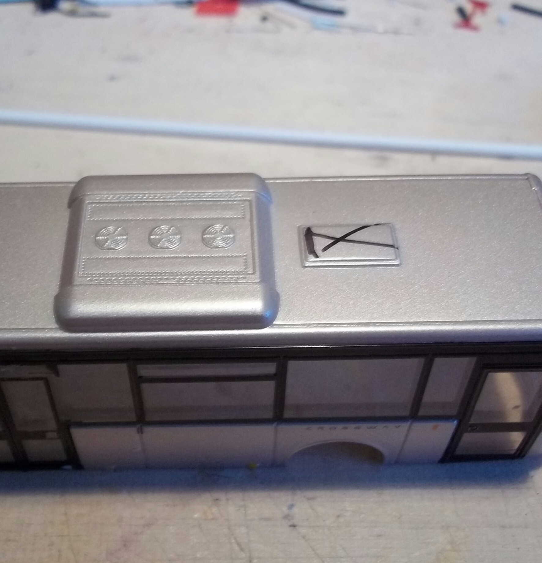 Mein zweites Problem war dann am Dach. Der Große Lüfter muß eigendlich um 5mm nach hinten versetzt werden. Leider ist dat Ding mit dem Modell ein Guß. Und so sauber wie Jürgen mit der Säge umgeht... Das bekomm ich nicht so sauber hin. Also bleib die da wo sie ist. Einzig das vordere Dachfenster wird weichen und das loch mit einer Platte geschloßen.