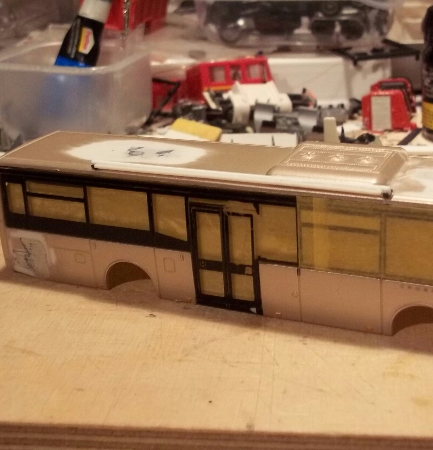 Und bevor ich mir Teile ab breche und das Modell ruiniere bleibt die Verglasung drin und wird abgeklebt. Ein weiterer Grund für mich ist das die Verglasung ja auch rot lackiert werden muß und ich dieses in einem Arbeitsgang machen wollte.