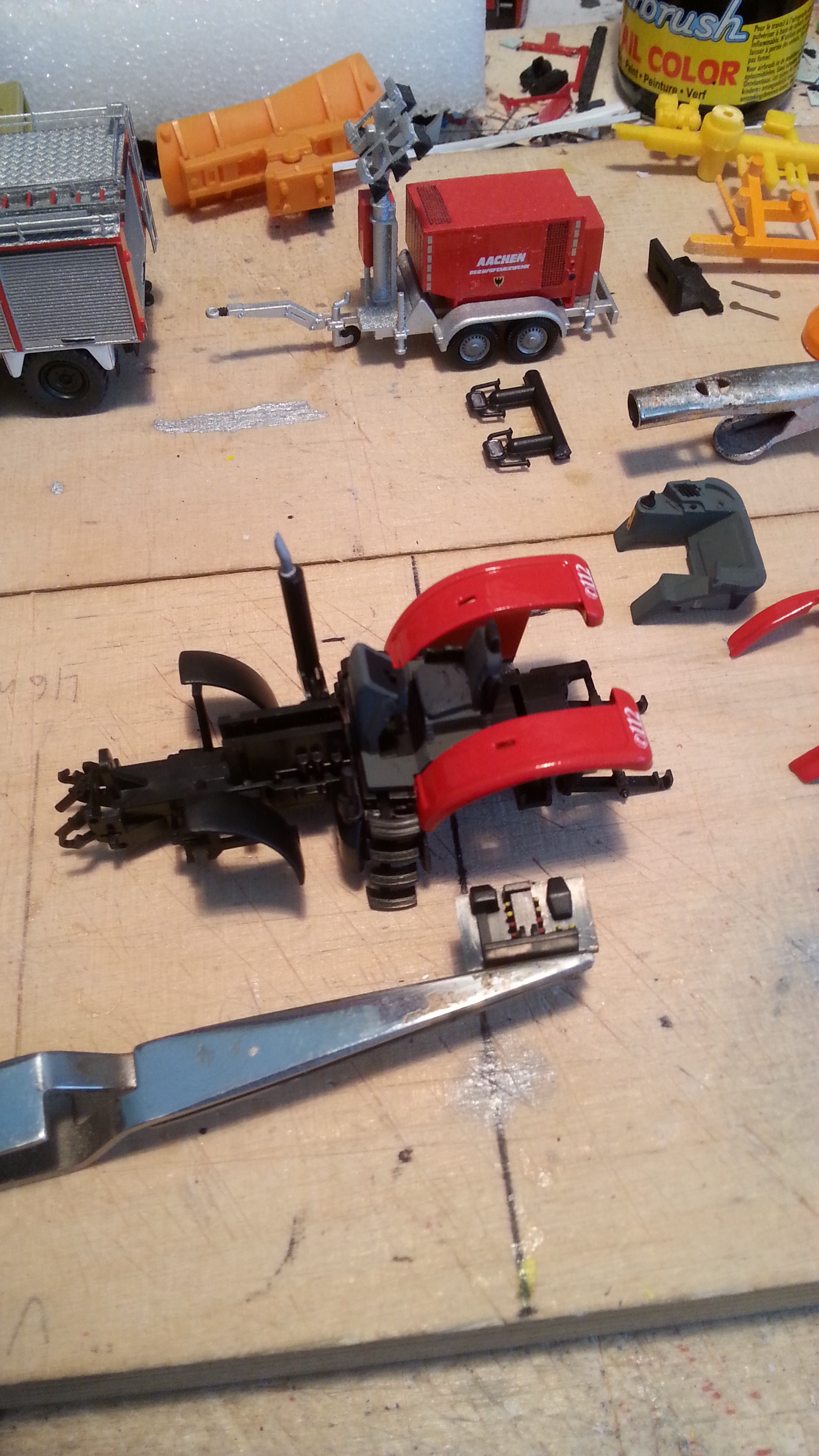 Mit und mit habe ich das Modell wieder zusammen gebaut. Paralel habe ich dann noch an einige Anbauteile gewerkelt. So wie Schneepflug, Salzstreuer und diverse Schaufeln und Gabeln für den Frontlader. Diese Teile spendeten Preiser, Roco und Wiking