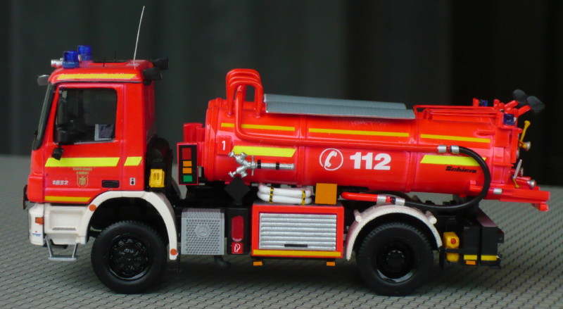 Der Actros-Auspufftopf von Herpa wurde durch ein Stück Auspuff von Kibri vervollständigt. Die Safelights stammen von M.B.S.K. und die Schäkel steuerte Rietze bei.