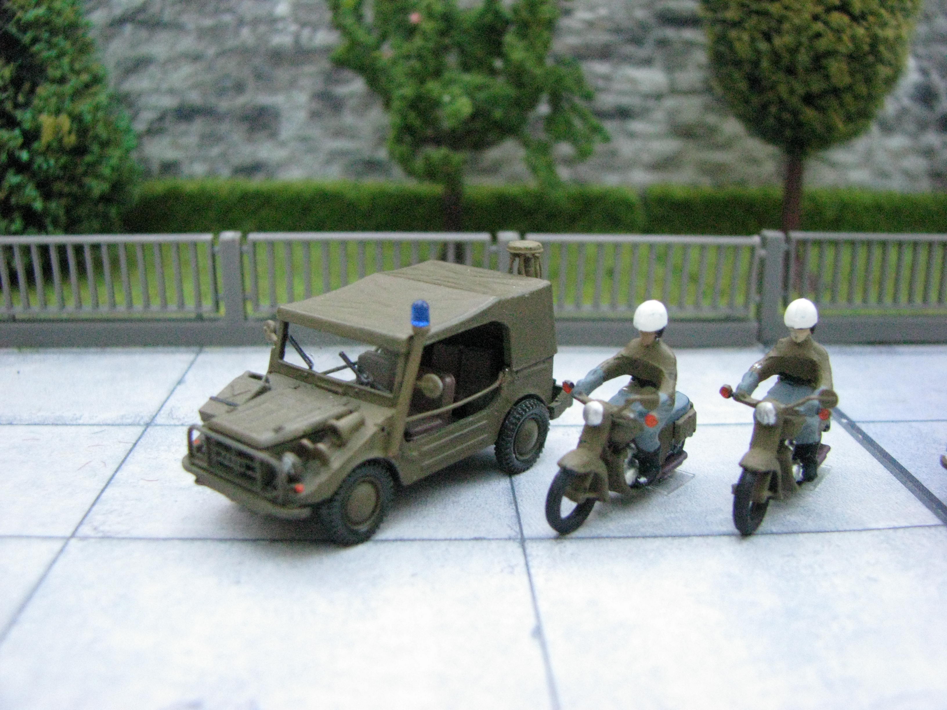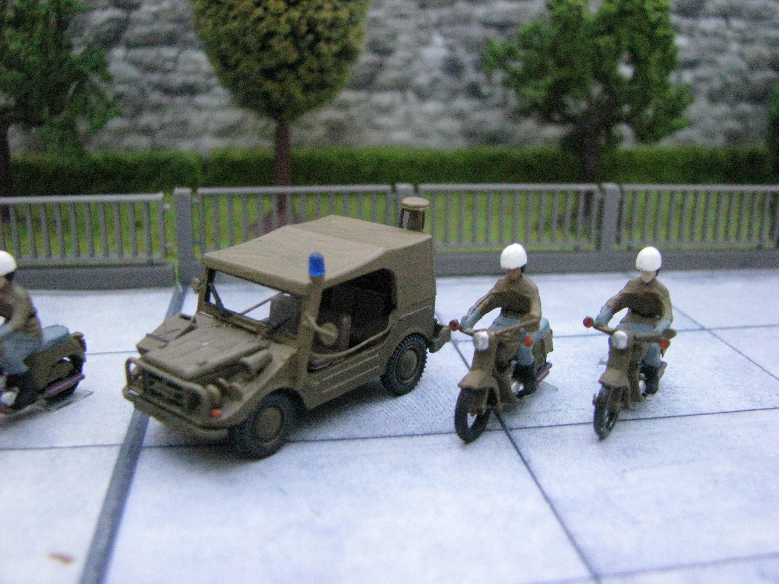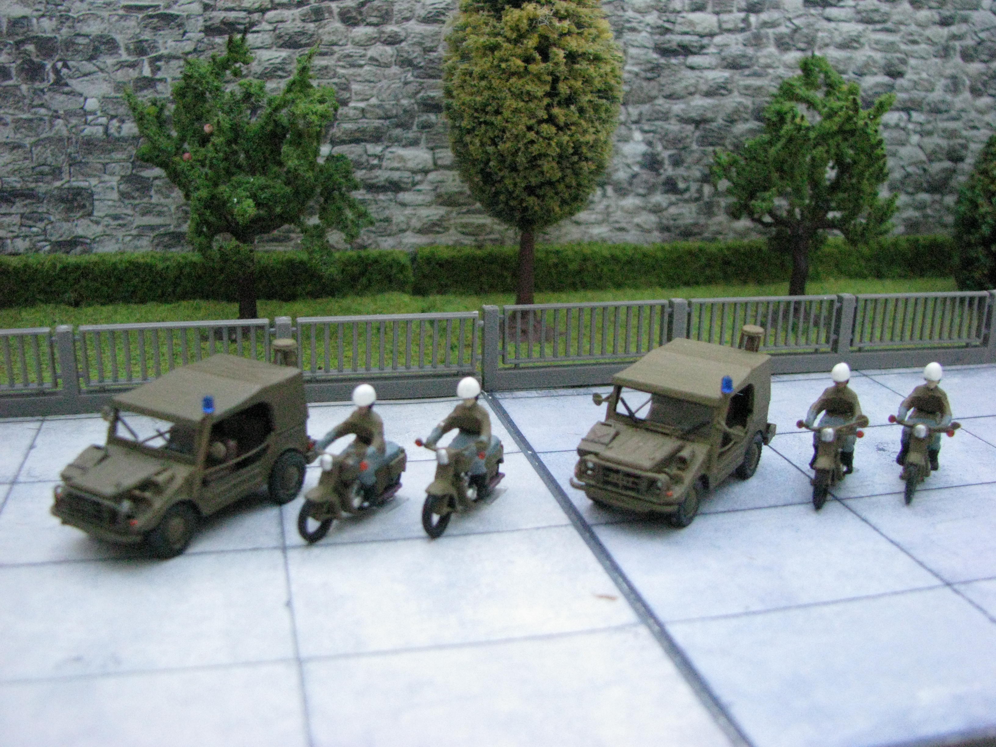 so ich habe mich Dank des Hinweises von Frank :D den Mungas nochmal angenommen und diese mit Blaulicht ausgestattet und bei den Kradmeldern die Ständer entfernt und diese auf einem Stück Plastik geklebt.