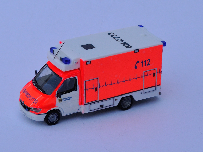 Das würde nämlich auch sehr schön erklären, warum dieser RTW als einziges Brühler Fahrzeug nicht das Kennzeichen als Dachaufschrift hat!