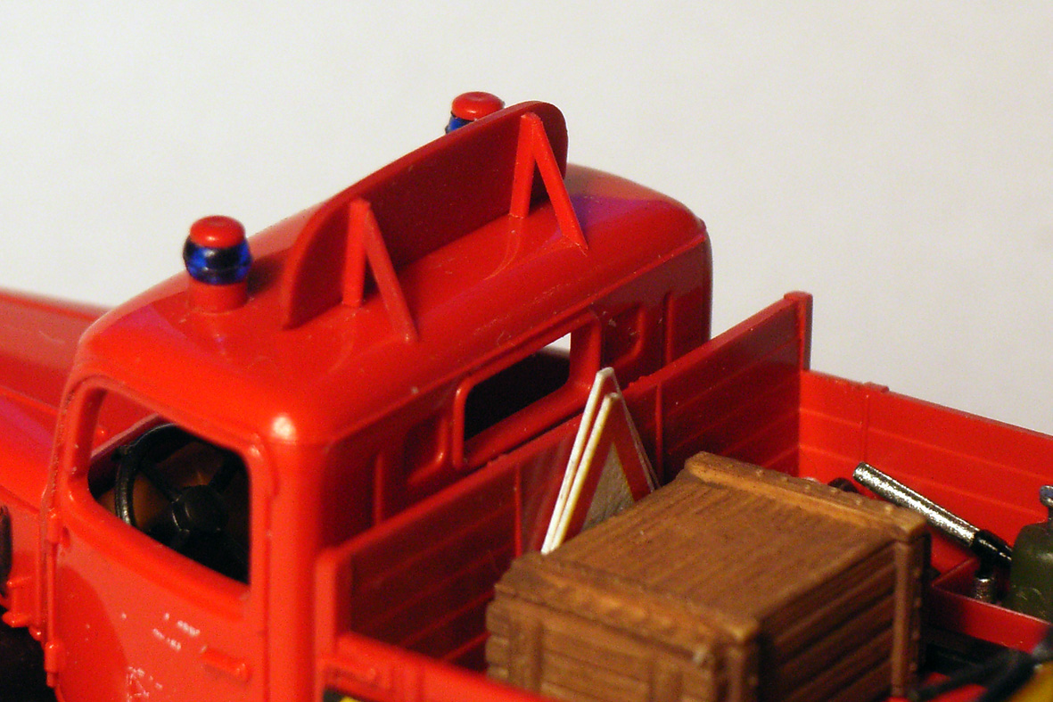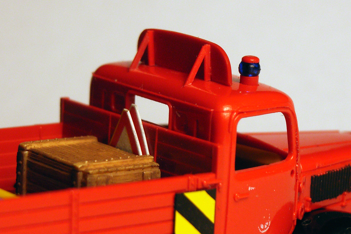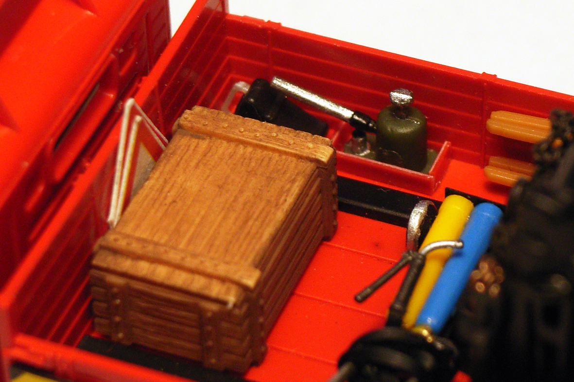 Und der Flaschen-Transportwagen ist (von außen "natürlich" nicht einsehbar) am Pritschenboden arretiert! Einzig das Argument der fehlenden Flaschenbefestigung kann ich nachvollziehen; nur leider gibt 's so filigrane Ketten nicht! Die dünnsten Weinert-Ketten hängen nebenan an der Kibri-Garderobe - und die sind viel zu dick! Ob ich da noch z.B. 'nen Lederriemen drumwickele, weiß ich noch nicht!