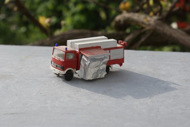 Als Basis diente hier der MAN- Kipper von Wiking. Baggerschaufel aus Pappe und Rettungsringe aus einem Stück Heizungsrohr