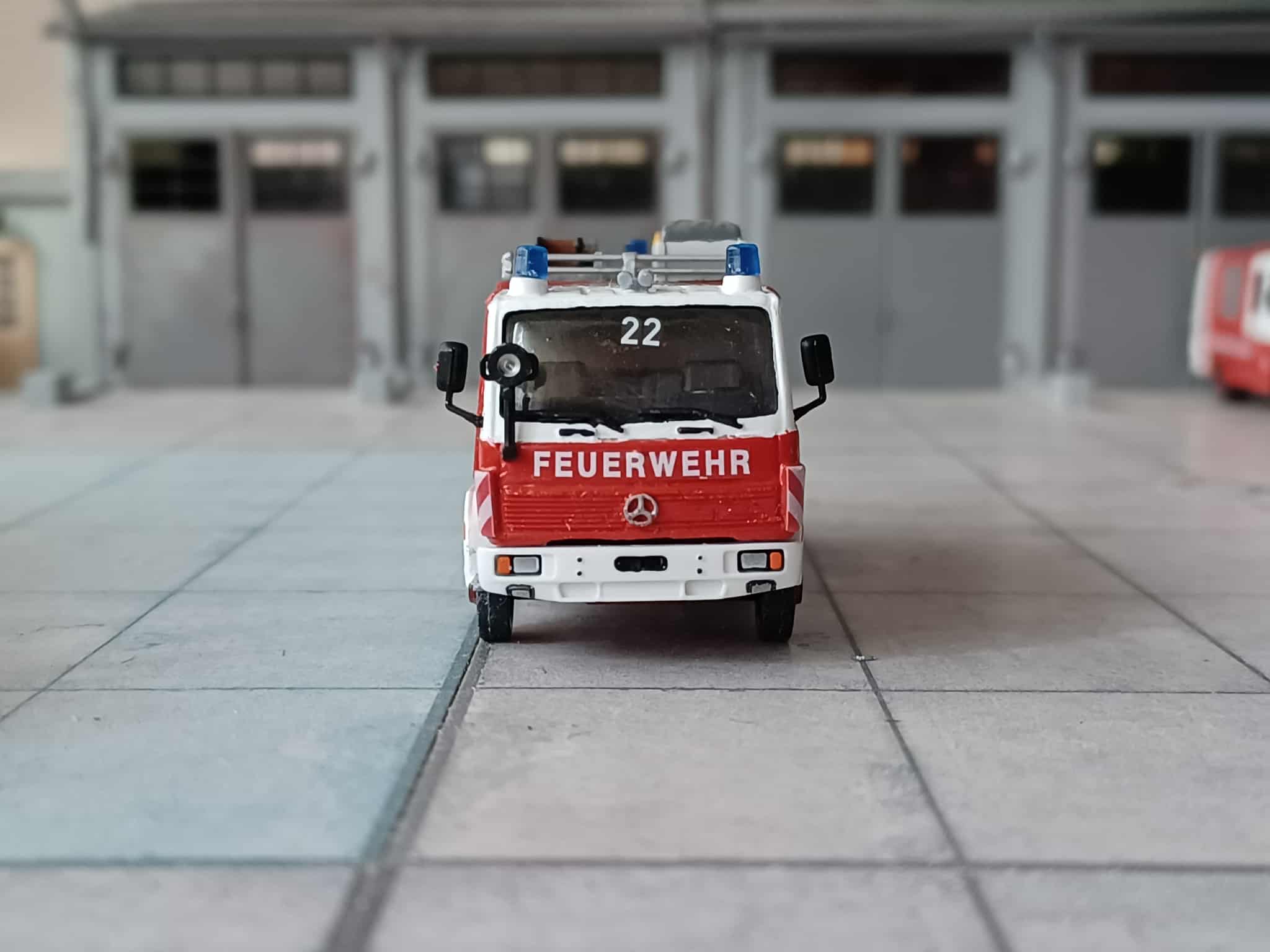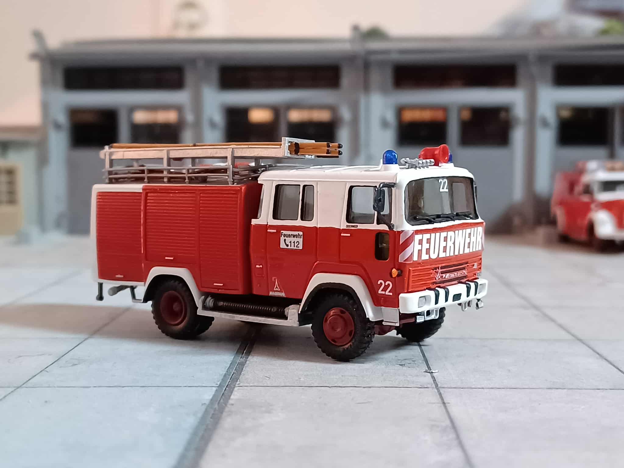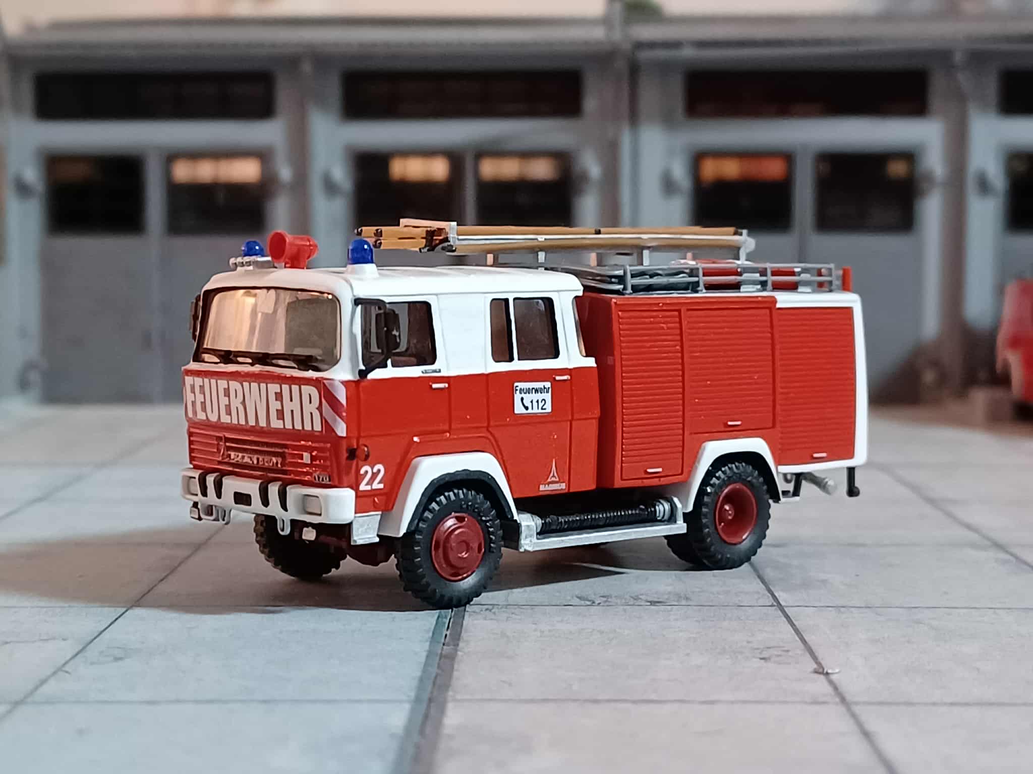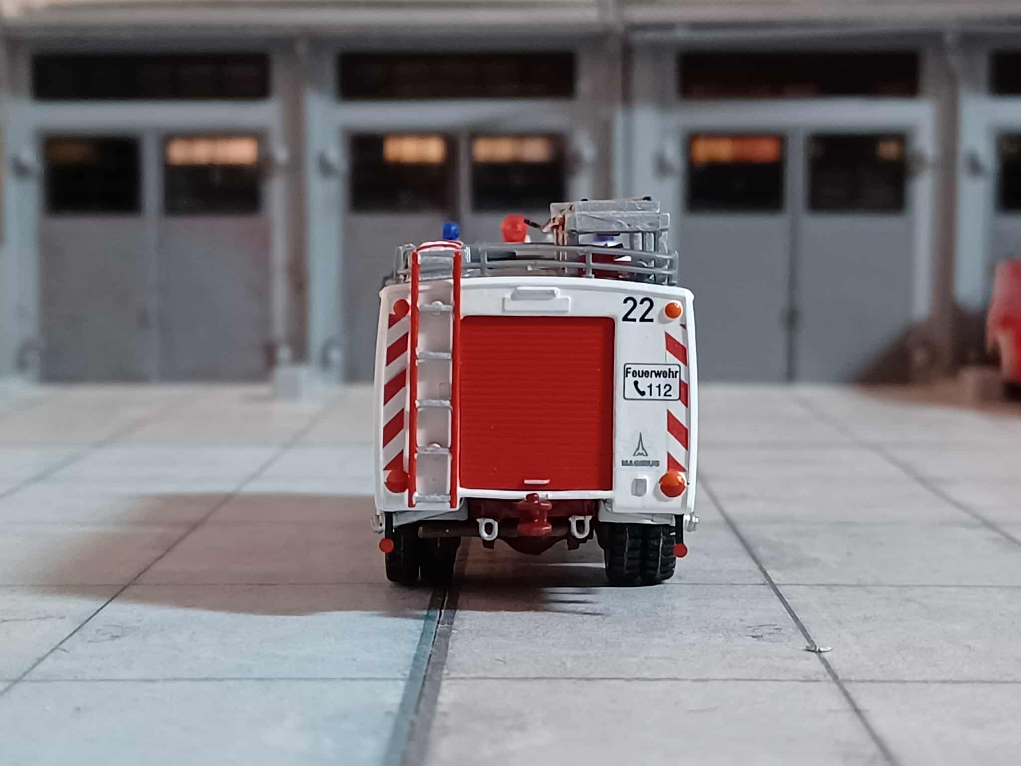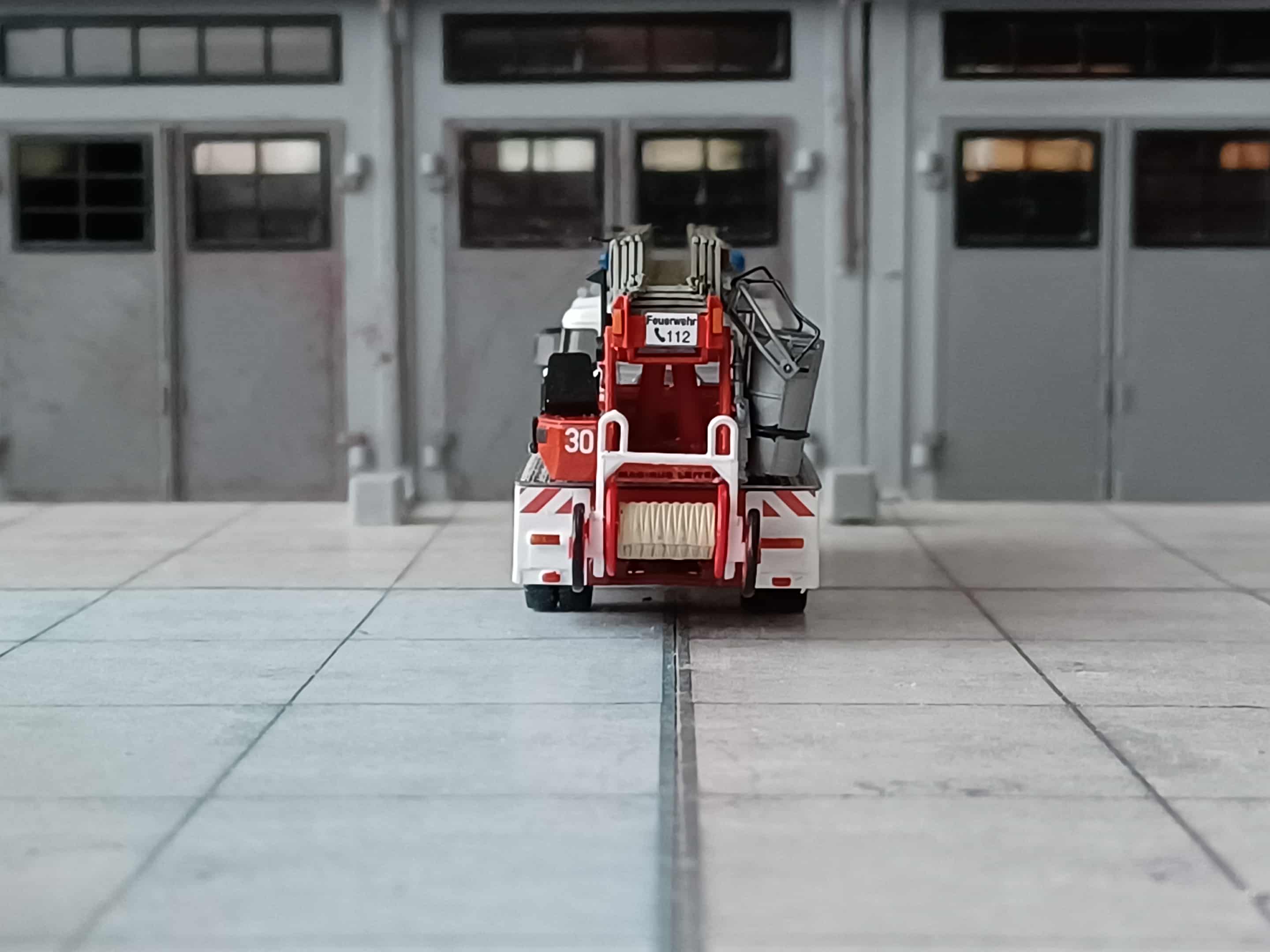 Ende der 70er Jahre wurde der Wunsch größer die alte DL 22 aus Vorkriegszeiten zu ersetzen. So wurde 1978 eine Drehleiter-Korb (DLK 23/12 St.) mit Staffelkabine auf Magirus Deutz FM 232 D 14 F, Aufbau Magirus beschafft. Das Modell entstand aus einem Roco TLF (Kabine und FG) sowie einer Preiser Drehleiter (Aufbau und FG) dazu jede Menge Kleinteile und Decals.
