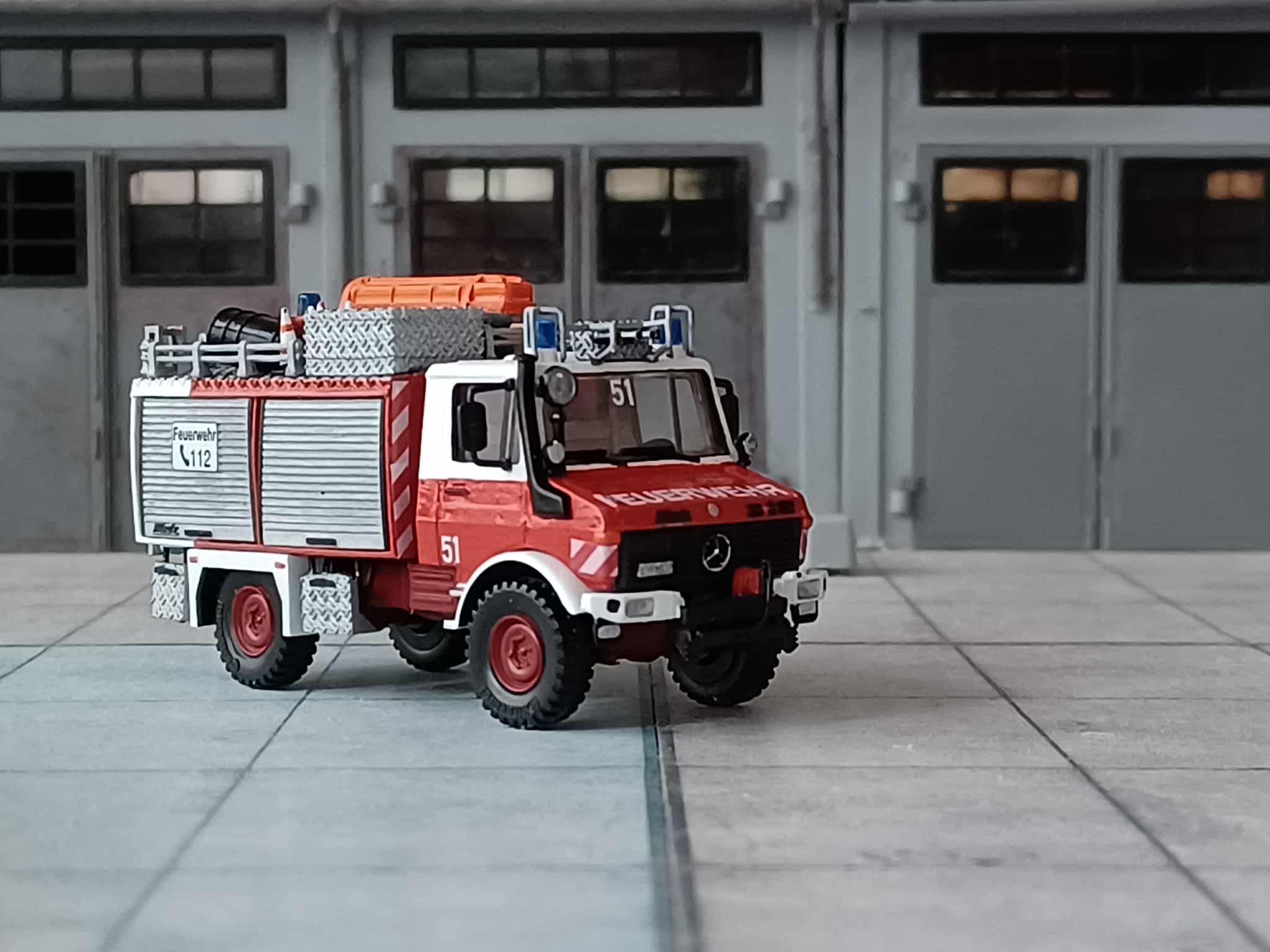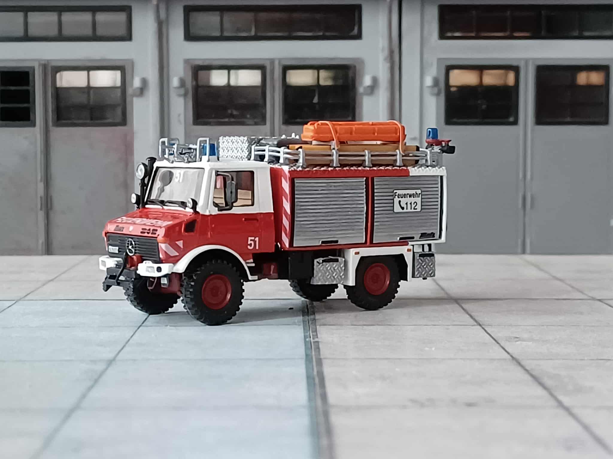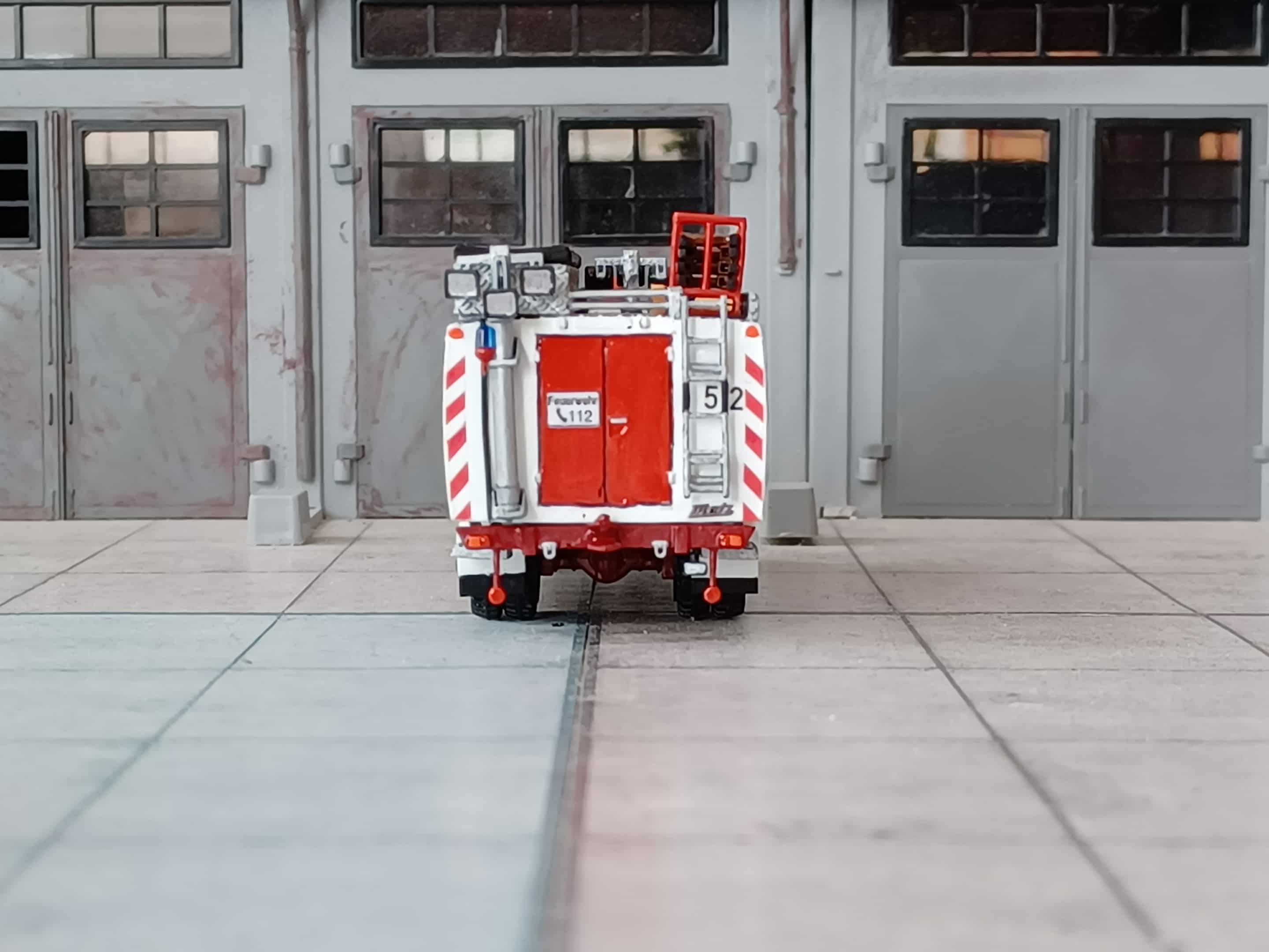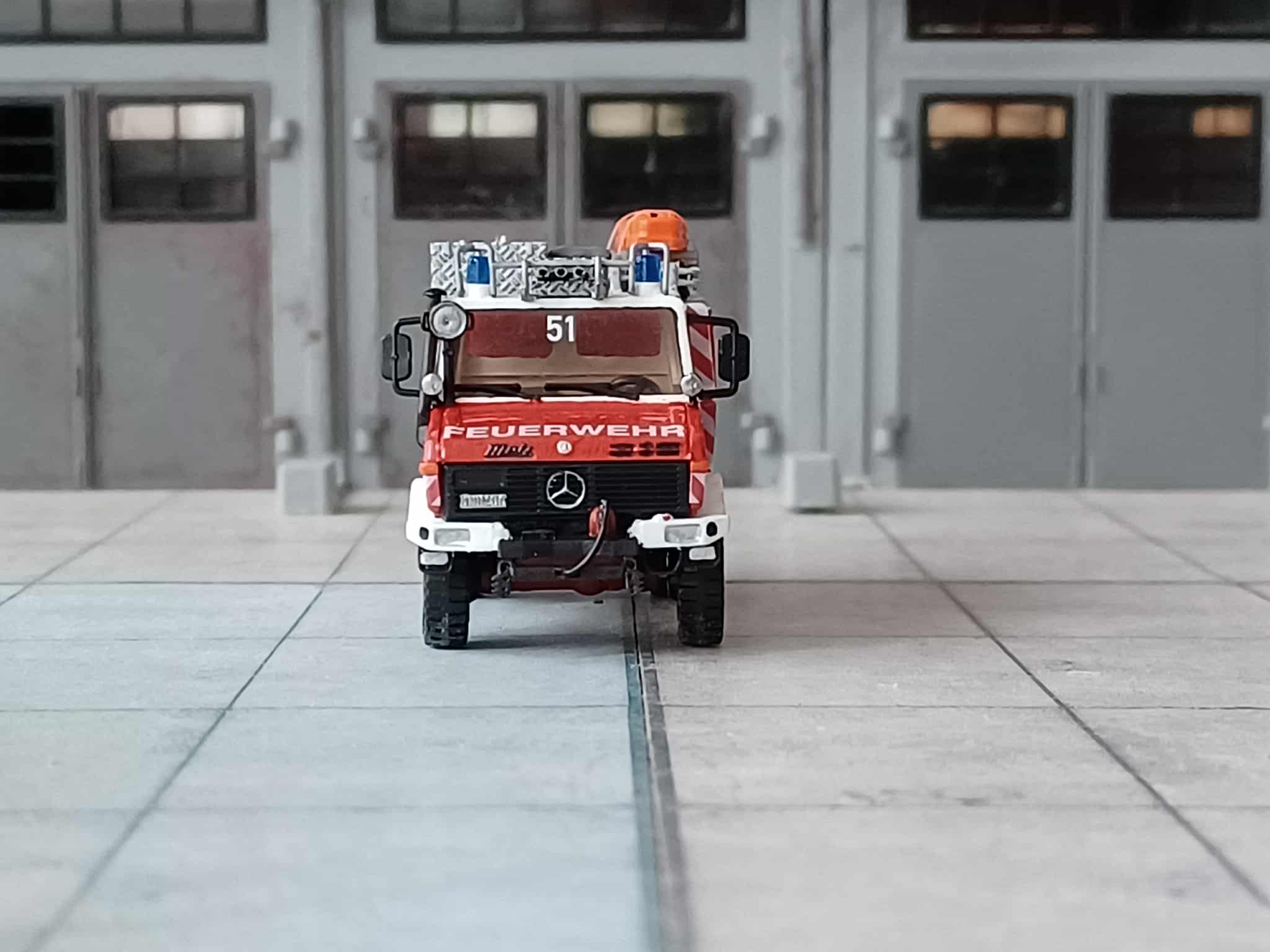 1988 beschaffte man einen neuen Rüstwagen RW1 auf Mercedes-Benz Unimog U 1300 L, U 435 mit Aufbau Metz. Das Fahrzeug stammt aus der gleichen Lieferung wie für Hamburg. Abweichend ist hier kein Schlauchboot verlastet. Das Fahrzeug steht bis heute noch im Reservedienst. Das Modell entstand aus einem Roco Grundmodell mit 3D Druck Aufbau von Niklas Bürger, dazu ein Paar Kleinteile und Decals