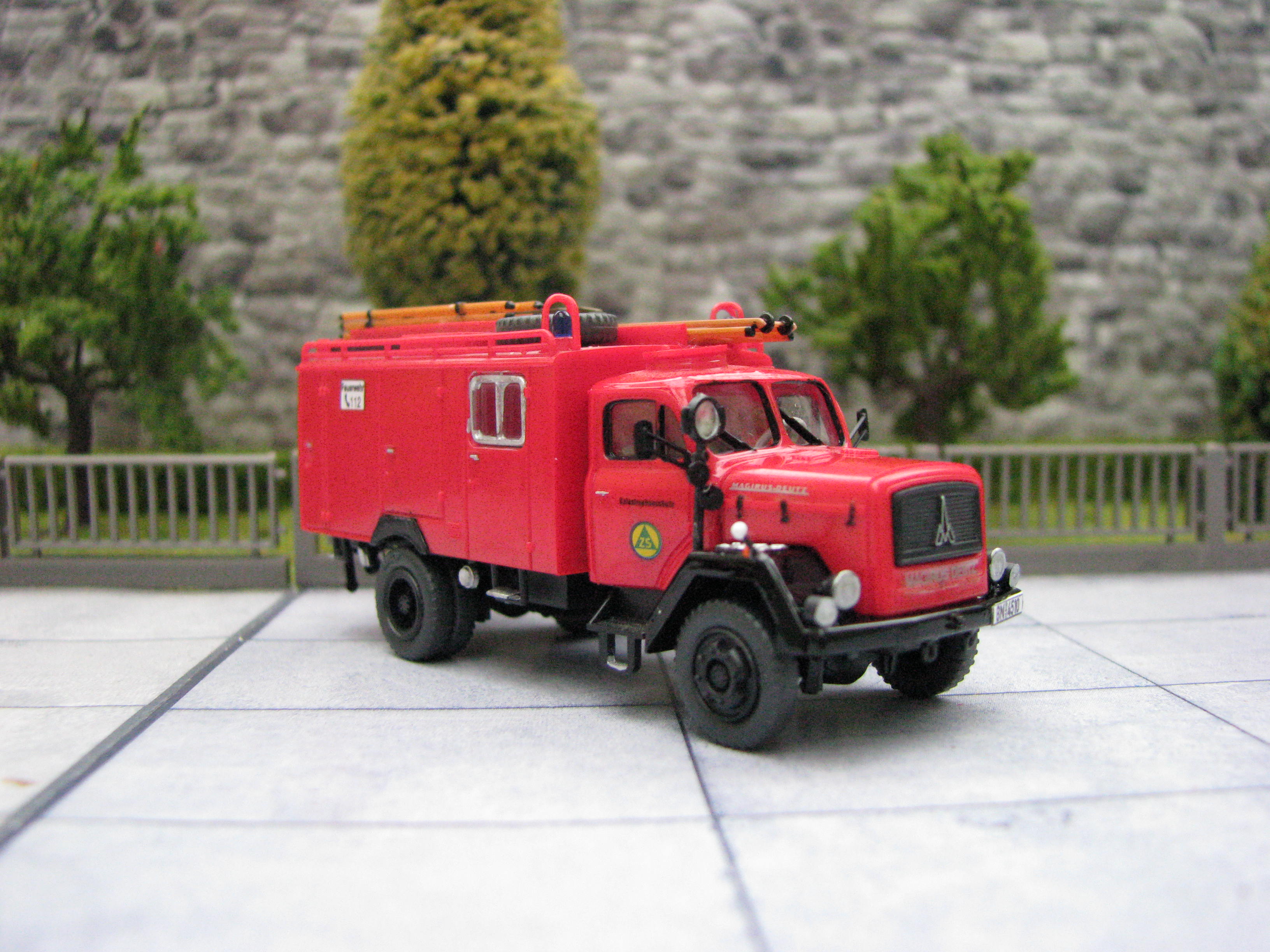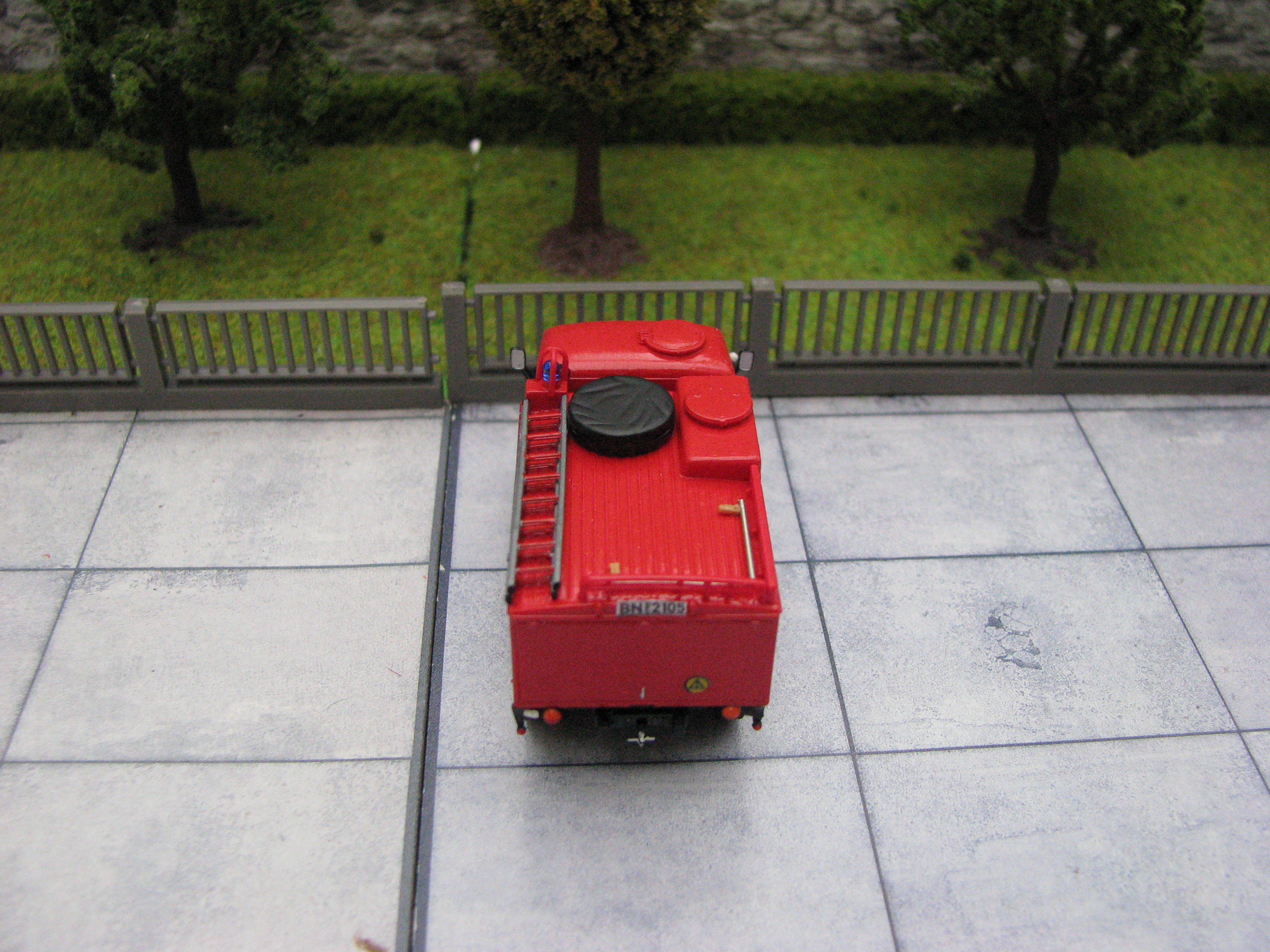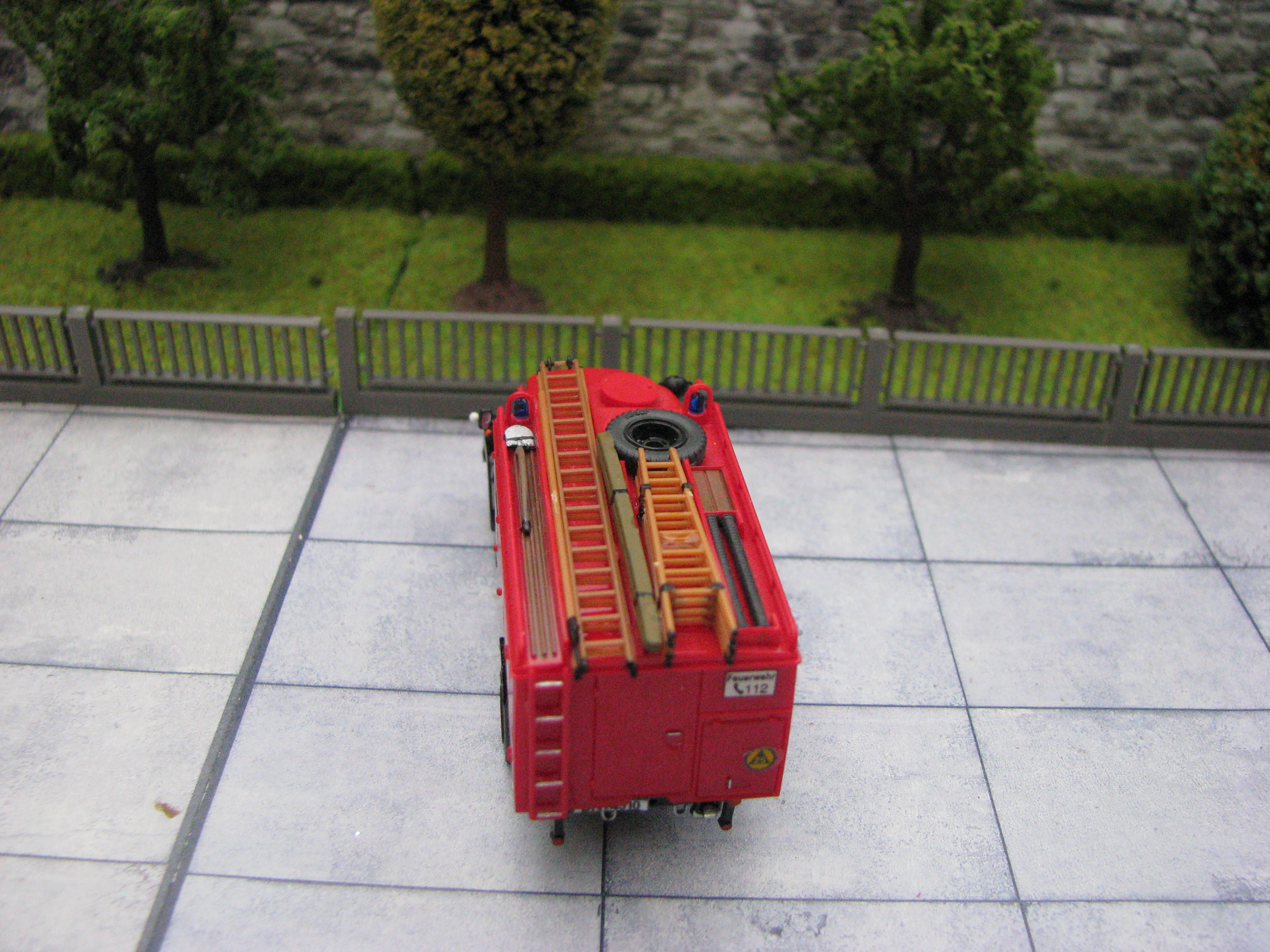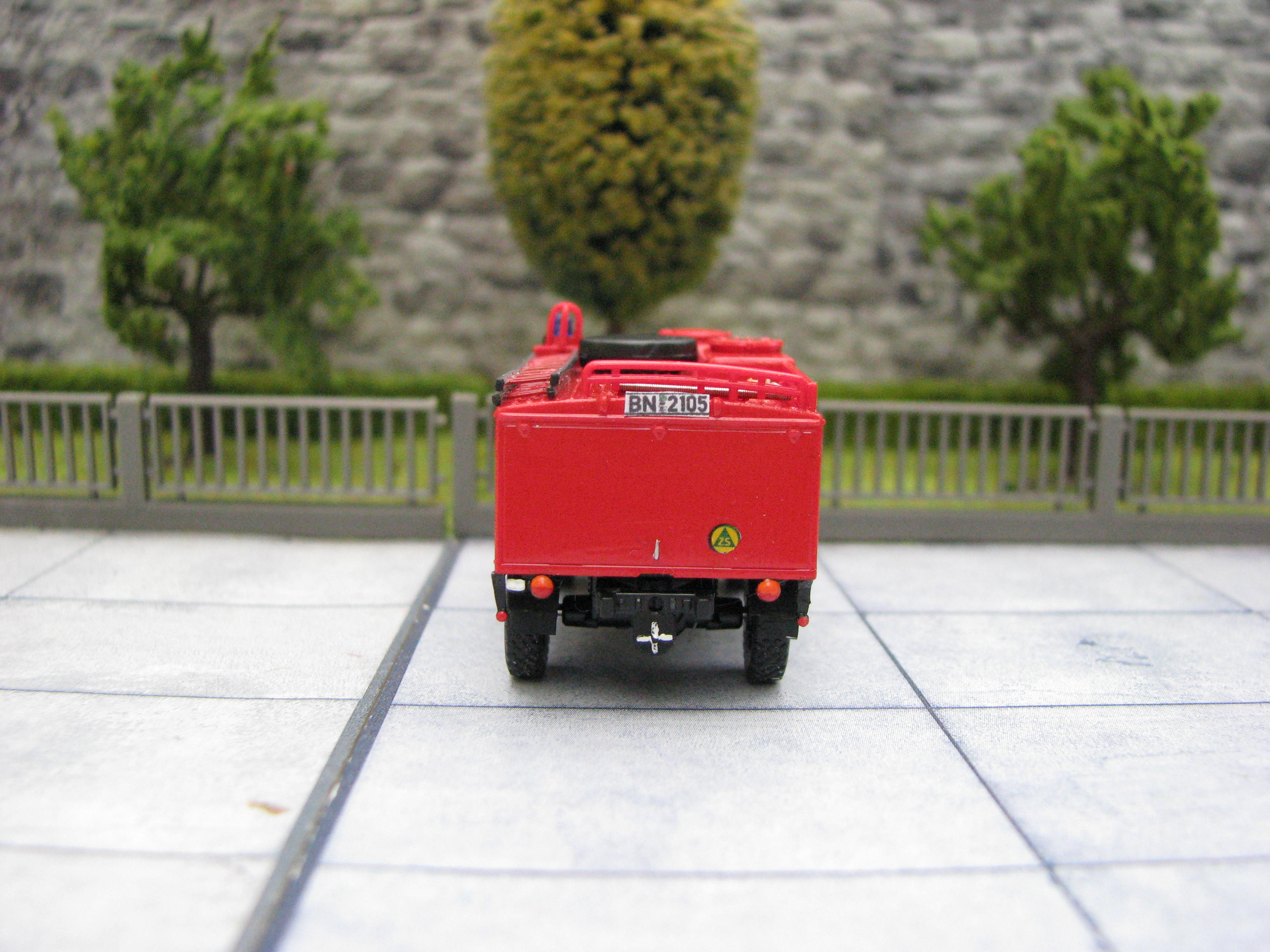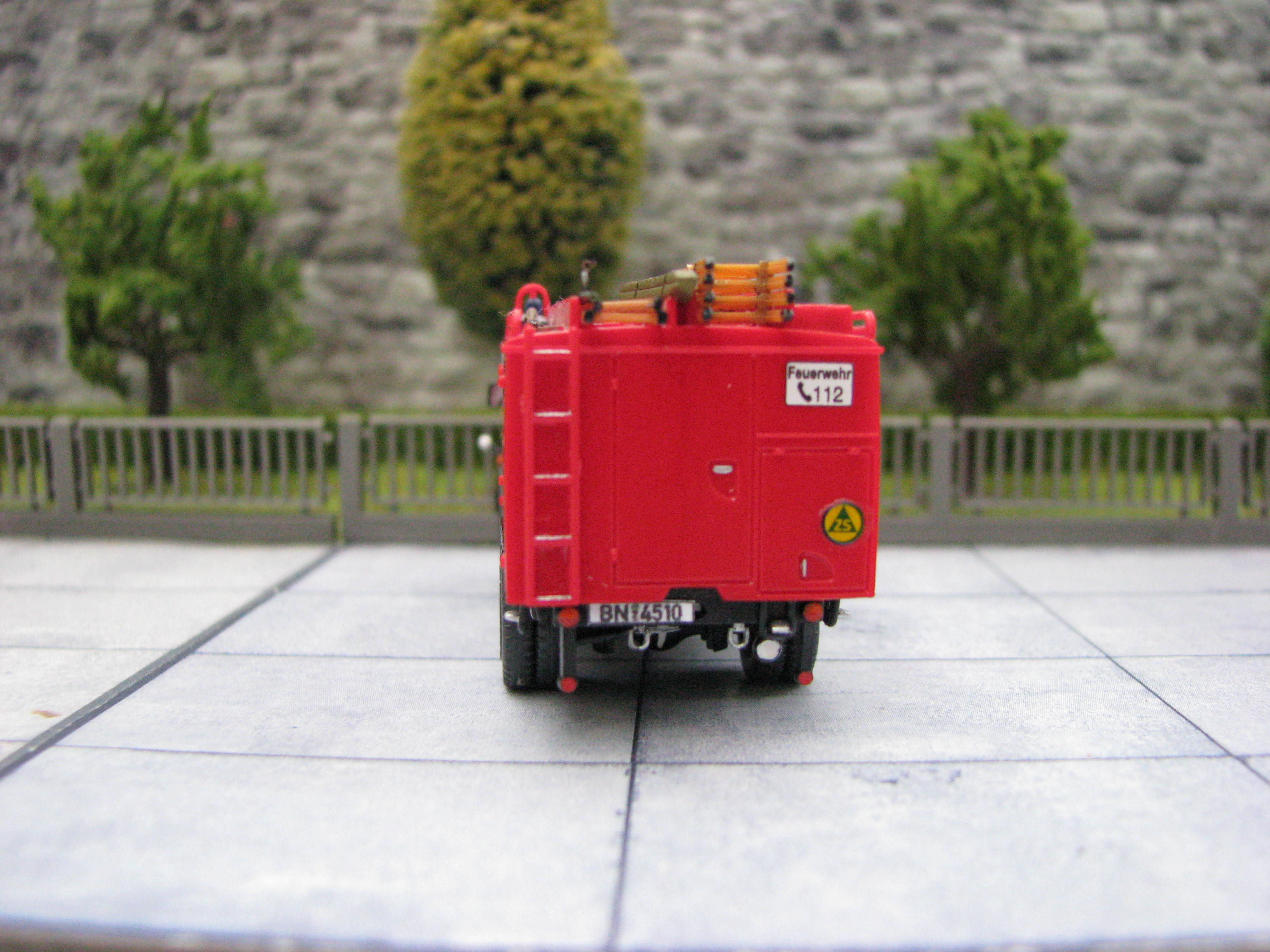 Das Modell wurde wie die anderen beiden auch mit einer zweiteiligen Schiebleiter und vierteiligen Steckleiter von Roco versehen. Die Klappleiter ist von Preiser. Sonst ist nur etwas Farbe und ein Paar Decals an das Modell angebracht worden. Da das Modell schon gebaut war, aber sich bis auf die Fenster im Aufbau und den Reservereifen zerlegen lies konnten die Gummidichtungen und die Leitern nicht richtig angebracht werden.