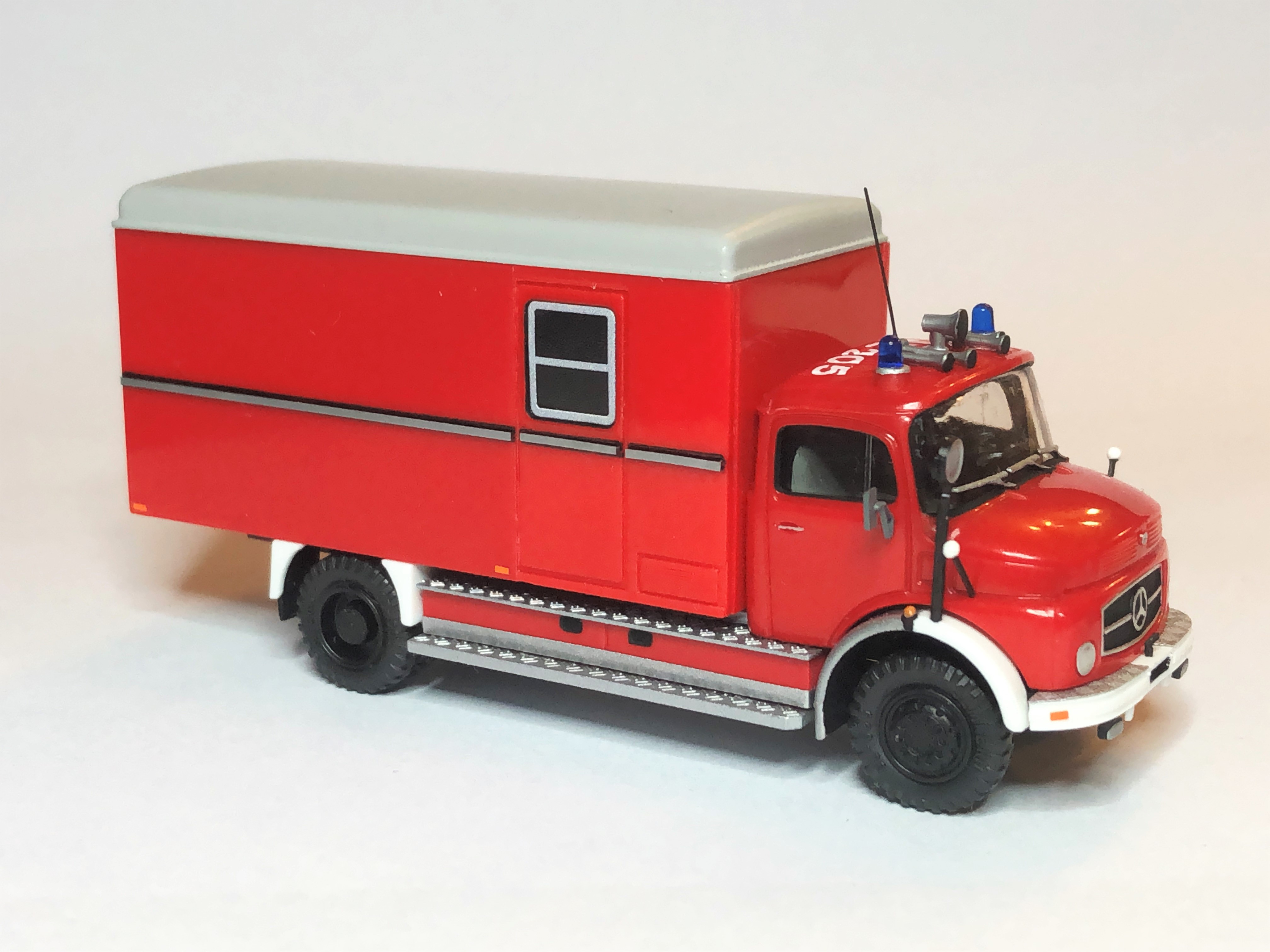 Jetzt möchte ich Euch natürlich Bilder nicht vorenthalten! Der geneigte Betrachter lege seinen Fokus bitte auf die Schnittkanten: Es handelt sich mitnichten einfach um den bekannten Preiser-Abrollbehälter... Und man beachte bitte den heckseitig montierten Lichtmast, der u. a. aus der Treibgasflasche einer Pulverlöschanlage entstanden ist