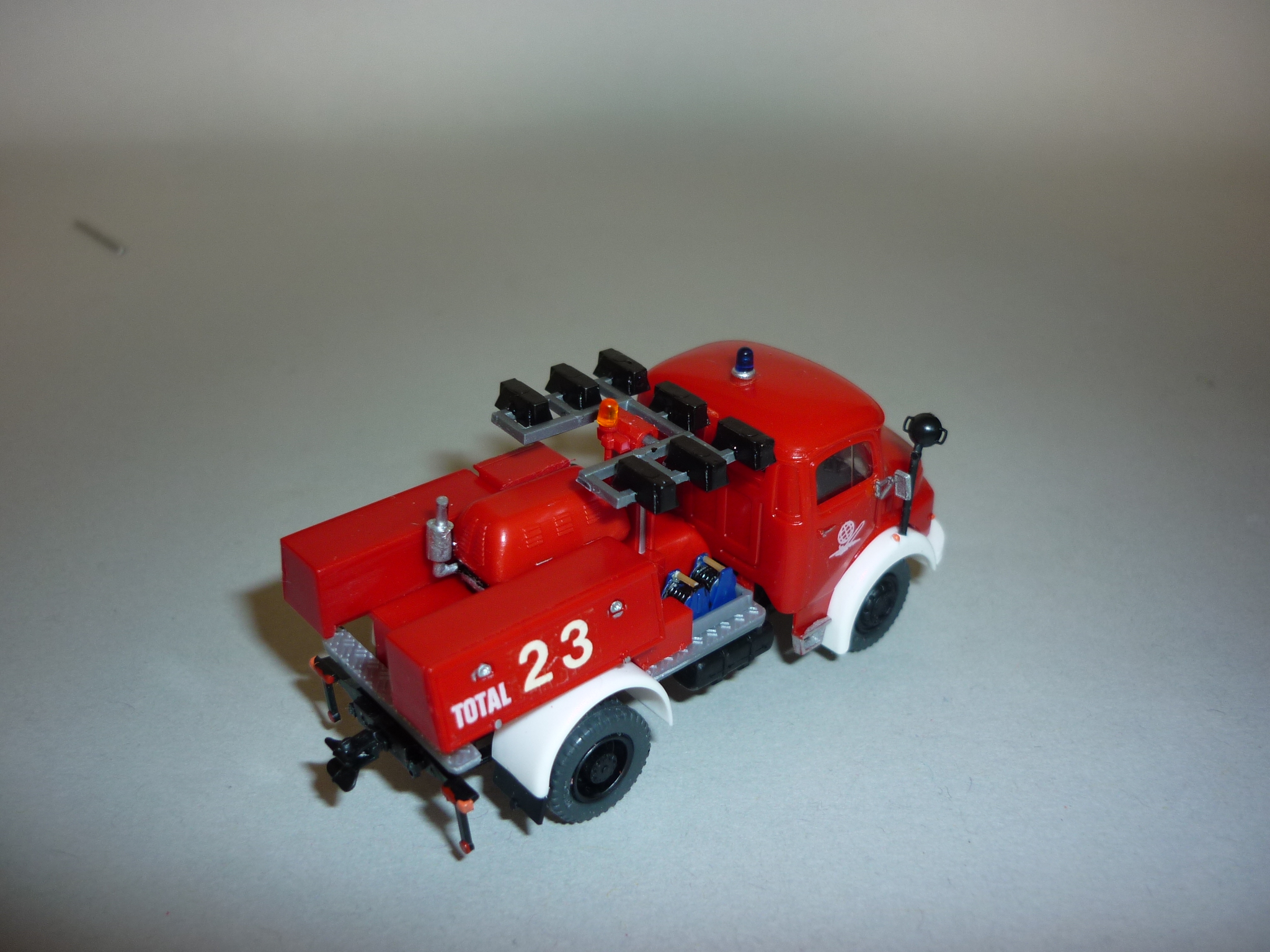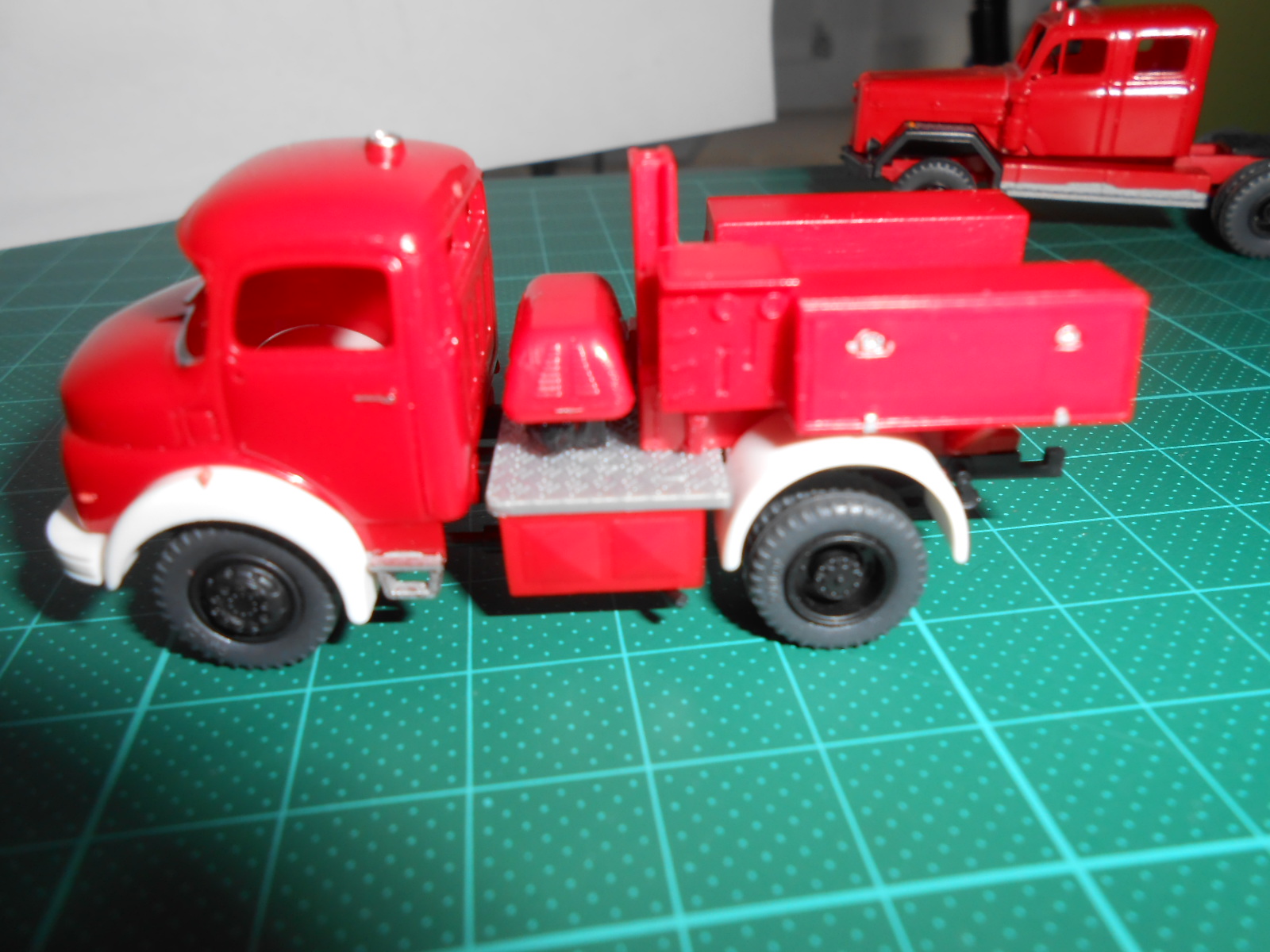 Basis Preiser, 2 Aufbauten der GMB zersägt und verlängert, Kabine ist Resteverwertung einer Kabine ohne Blaulichtsockel, diese wurde im Dachbereich abgeschliffen und wieder poliert, hat einige Schnippselei erspart.