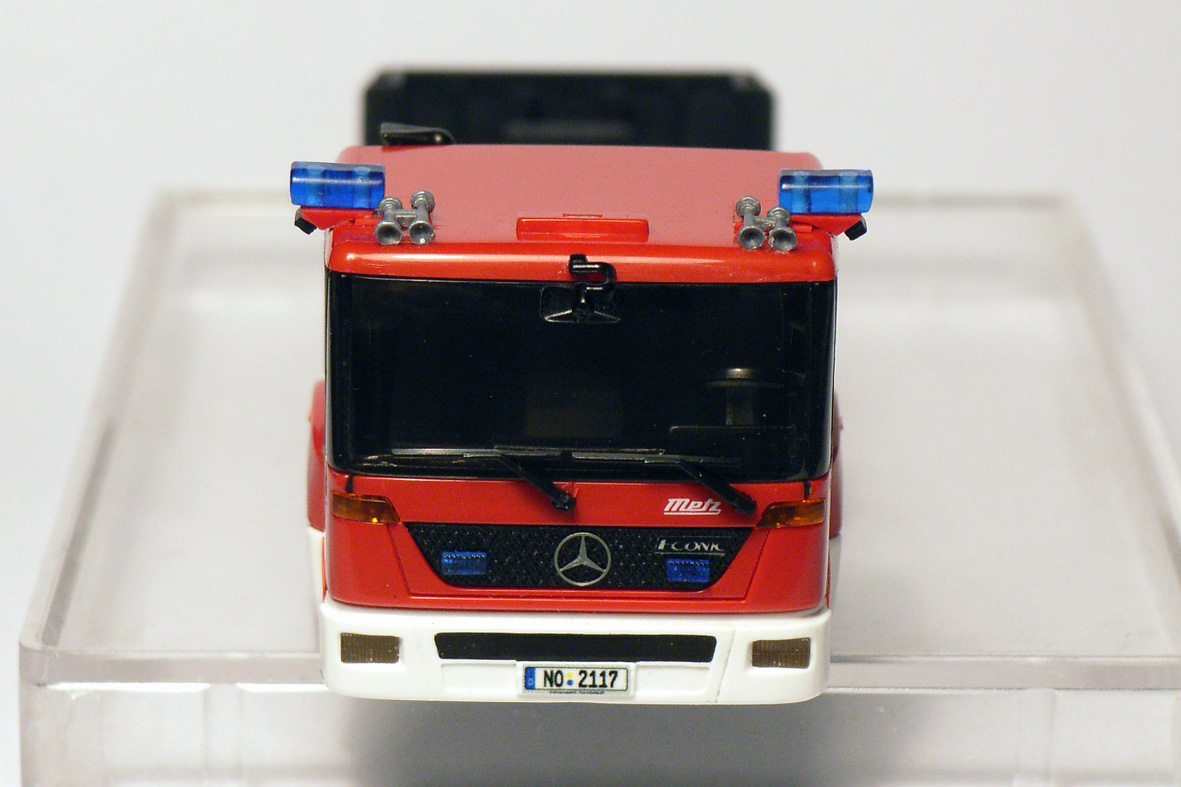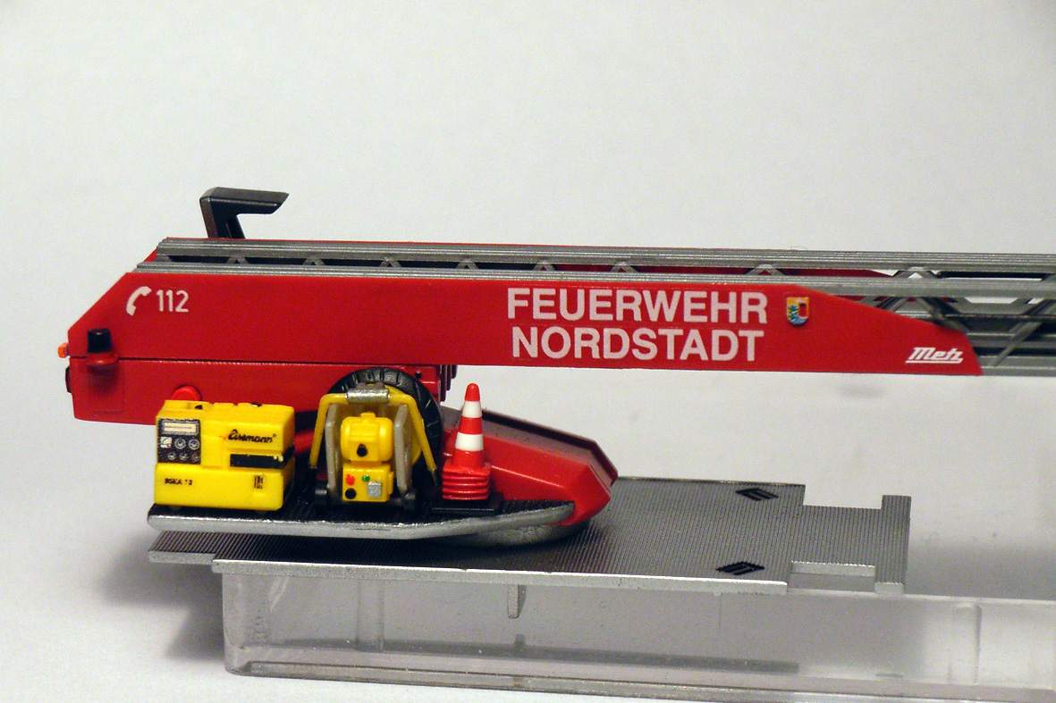 Die angespritzten Blaulichtsockel der (alten) Econic-Leiter wurden entfernt, dafür sitzen meine RKL wieder mal auf roten Lkw-Unterlegkeilen! Der Rest sind ein paar Decals und ein bißchen Farbe: