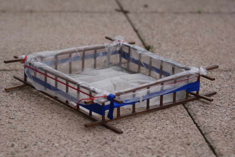 Aber bist Du Dir sicher, dass die Leitern unten nicht auch zusammen gebunden gehören, da sie sonst bei einer ungeschickten Berührung oder viel Wasser "im Tank" doch auseinander rutschen bzw. weg gedrückt werden könnten? Ich kenne mich da nicht mit aus, aber ich persönlich würde da auf Nummer sicher gehen (ja, ich habe gesehen, dass die "ein Ende drüber, ein Ende drunter" zusammen gesetzt sind, aber reicht das wirklich aus?)...