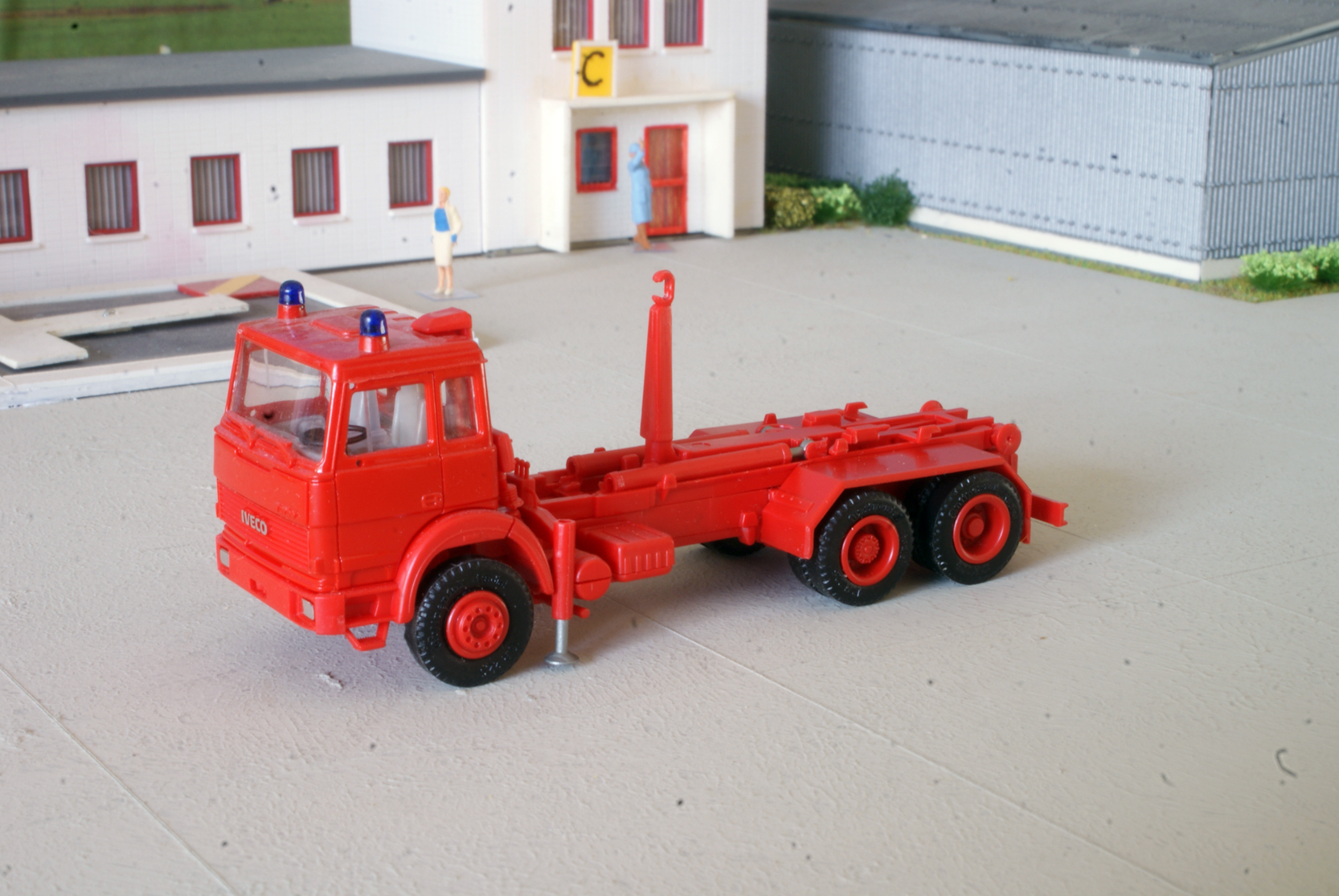 Mit Hilfe etwas Farbe und Decals sind die Modelle angepast an die aus der Herpa Serie. Die Iveco: Weisse Kotfügel, Schwarze Fenstergummis, Gelbe Haken, Neue Räder und Felgen, Extra lampen, Blinker angemalt und Decals angebracht.