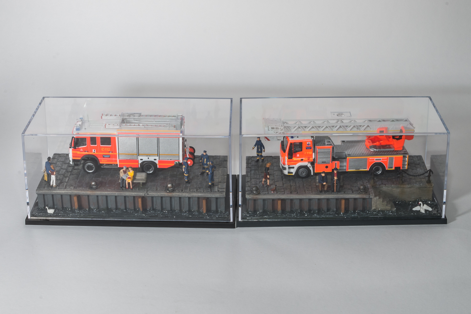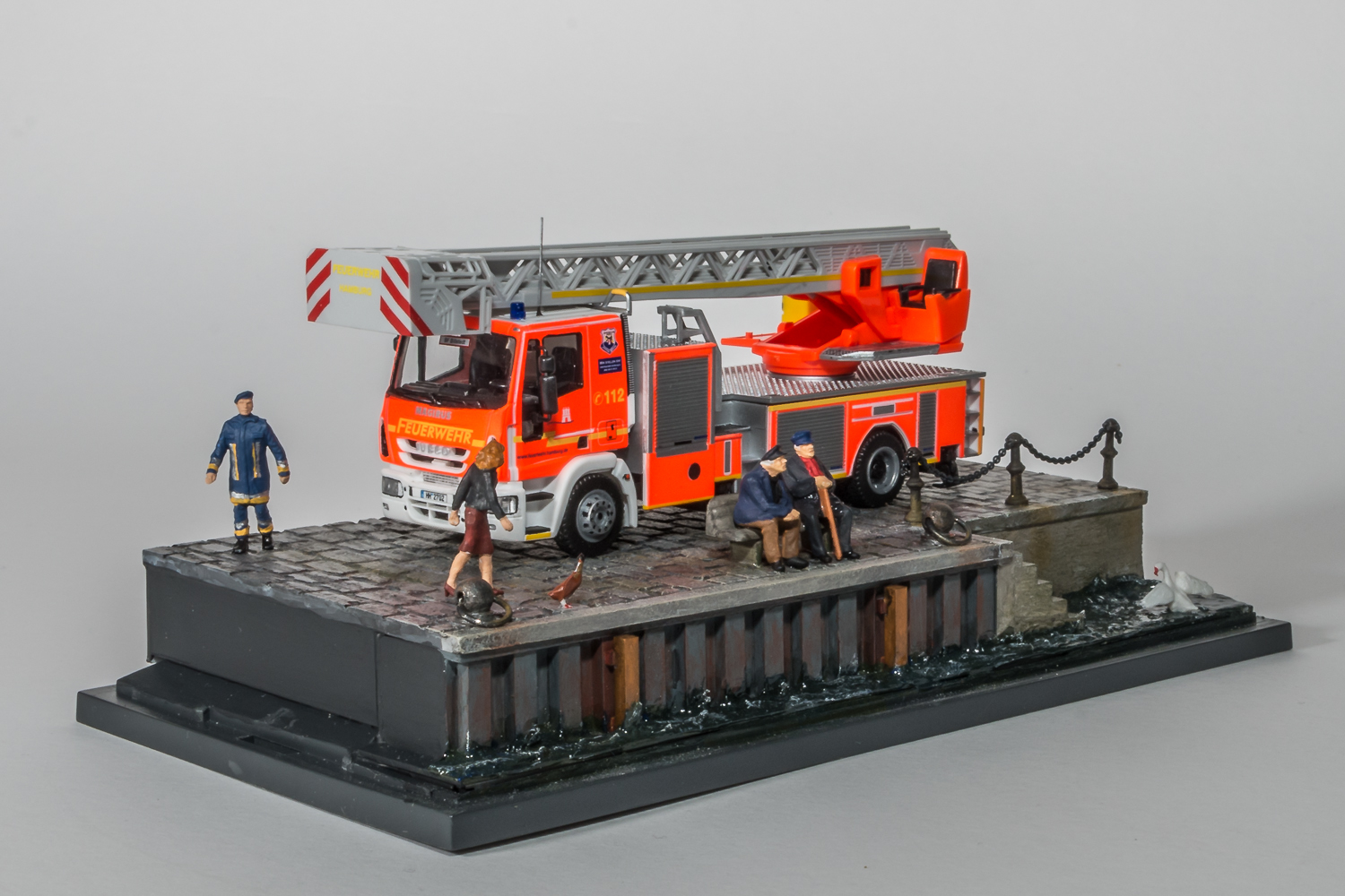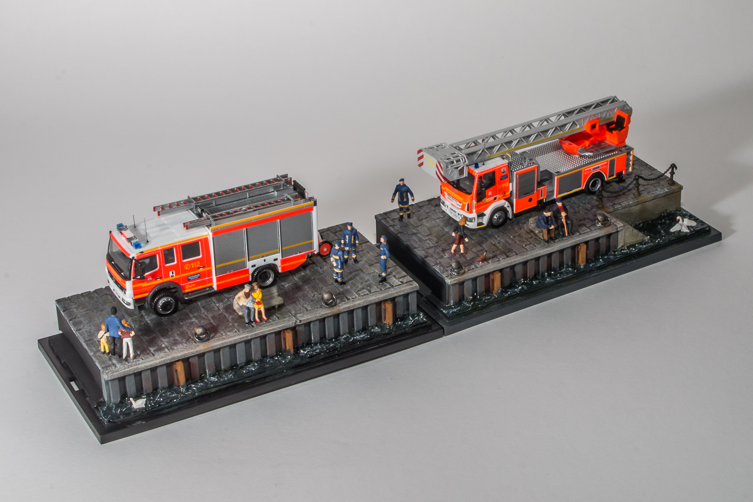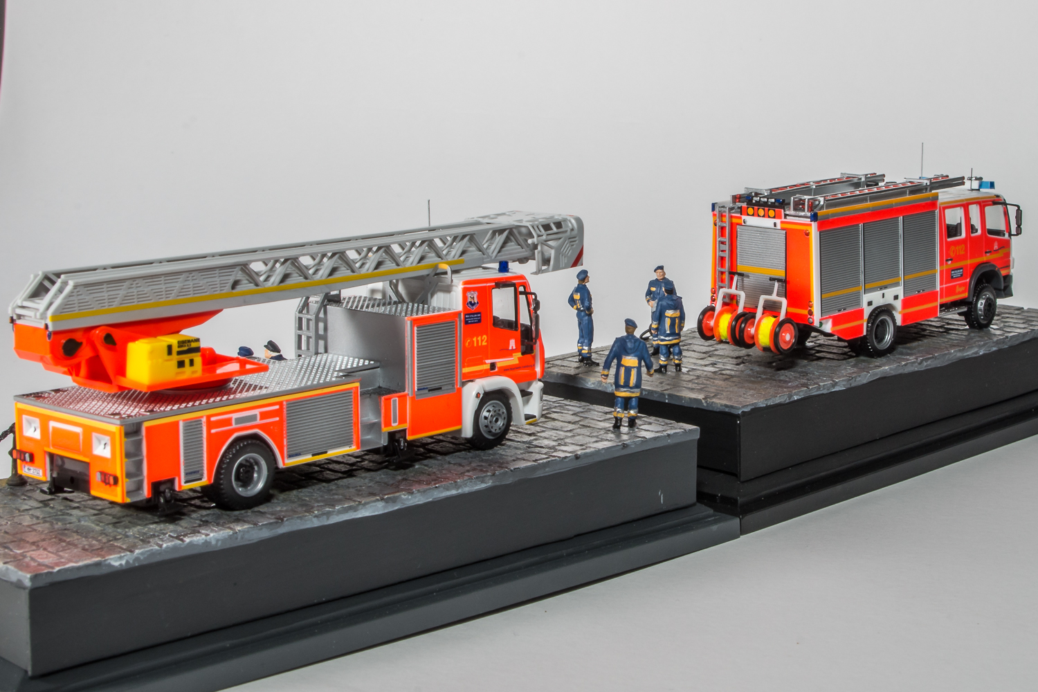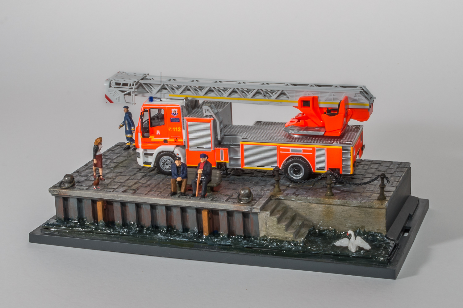 Auch wenn Du das mit den aufgesetzten Bodenplatten schon länger machst (ist mir eben erst in der neuerlichen Durchschau des ganzen Threads aufgefallen), so ganz bin ich (rein selbstpersönlich und absolut subjektiv) davon nicht überzeugt - ich hätte es optisch schöner empfunden, wenn die Wände der Platte bis auf die Schrägen des eigentlichen Sockels reichen würden. Ist allerdings ein wenig Fummelarbeit wegen der notwendigen Abschrägung der unteren Kanten des Aufsatzes. Ich habe das bisher ganz gern gemacht... Aber wie gesagt, reine Geschmacksfrage, schmälert den tollen Eindruck Deiner Dioramen absolut nicht.