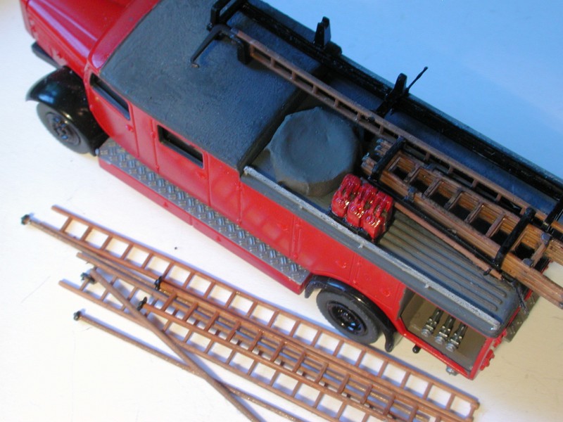 Das Chassis stammt von einem Albedo-MAN-Möbelwagen (verkürzt), die Kabine vom Wiking-L 2500 und die Haube nebst Grill vom Wiking-L 10000 (verschmälert und erniedrigt sowie mit seitlichen Luftschlitzattrappen versehen). Traversenkästen und Podest sind Eigenbau aus Evergreen unter Verwendung von Riffelblech einer alten Herpa-DLK. Leiterpark samt -stuhl spendete eine Roco-DL 22 (SDL) auf Mercedes L 4500, und die hinteren Kotflügel waren im ersten Leben vordere eines Wiking-Büssing 8000. Die vorderen Kotflügel wiederum sind die hinteren des Roco-TLF 15 auf Opel Blitz Allrad. Und wo wir gerade davon reden ...