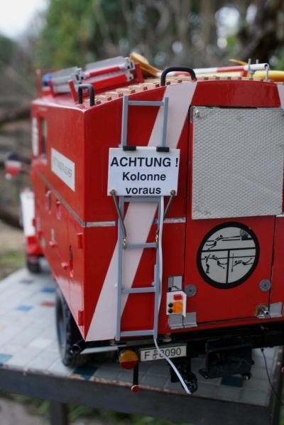 Die geänderte Art der Befestigung ergibt sich aus dem Zwang, das das Magirus Fahrgestell, das einzige ist welches mit einer Anhängersteckdose ausgestattet ist. Für den Magirus habe ich aber drei verschiedene Aufbauten (Wasserförderwagen/ LF16-TS/ und Gerätekraftwagen). Bei zwei der Aufbauten habe ich eben auch stabile Wände die ich nicht anbohren möchte für den Schilderhalter. Aus diesem Grund eben die Abspannung mit Federn.